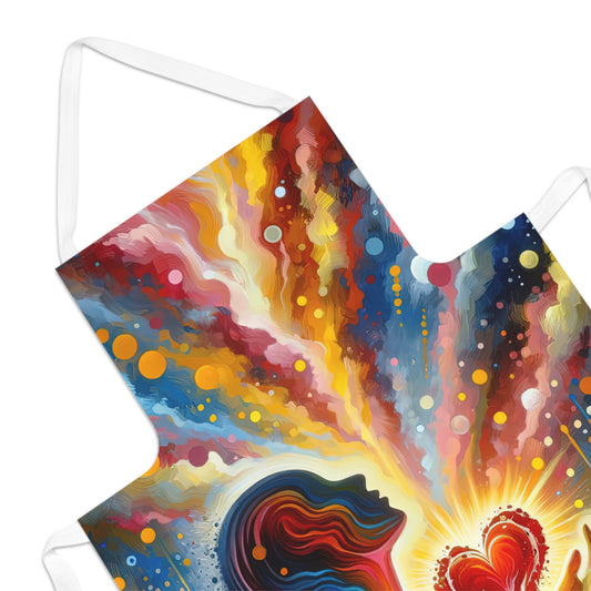 The image titled Unified Awakening Heart is a vertical artwork rendered in the Tachism style. It captures the abstract and emotional concept of Awakening the Unified Heart through vibrant and energetic brush strokes that convey movement and transformation. At the center, a human figure is outlined in fluid, swirling patterns of colors, suggesting complexity and depth within the being. The figure s profile is gazing upwards, with an expression that signifies reverence or possibly an epiphany. Cradled in the hands of this figure is an effulgent heart, bursting with light and painted in reds and oranges that echo the warmth and passion of living. This heart is more than just a physical representation; it appears to be the source of a great eruption of energy, projecting upwards in a column of light and color that bisects the canvas. The majestic plume of this burst is composed of fiery hues, with myriad dots and flecks simulating stars or sparks, implying a cosmic or spiritual dimension to this awakening. The background is a tapestry of abstract color, with blue, red, orange, and white tones colliding and merging in a celestial spectacle. The occasional orbs and streaks of paint suggest celestial bodies or energies, adding to the transcendent feel of the artwork. The overall effect is one of profound awakening, where heart and spirit unite in a singular moment of enlightenment or intense emotional release.