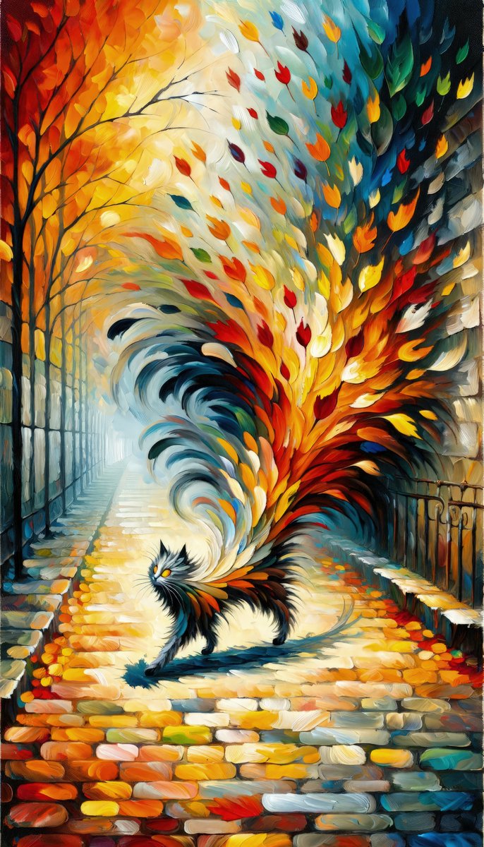 The image titled Autumn Whirlwind Escape is a vibrant, vertical Tachism style painting, bustling with dynamic strokes of color that spark the imagination. At the center, an errant cat serves as the visual anchor, its coat exploding in a stunning array of autumn leaves that seem to whirl around it in a fierce display of movement. The feline s presence is accentuated by piercing yellow eyes that stand out against the flowing, fiery hues. A cobbled path extends into the distance, flanked by trees and a fence on one side. The path itself is a patchwork of golden, orange, and red tones, reflecting the rich palette of fall. The leaves depicted emanate from the cat, creating a sense of swift motion, as if the creature were part-spirit of the season itself. Some leaves cascade gently towards the ground, while others are caught in the tempestuous swirl surrounding the cat. Glimpsed on either side of the path are hints of a wrought iron gate that silently observes the scene. In the background, the path appears to converge into a soft, misty vanishing point, inviting curiosity about the cat s destination. The delicate interplay of light and shadow brings depth to the scene, inviting the viewer into a world where the lines between the real and the mystical are beautifully blurred.