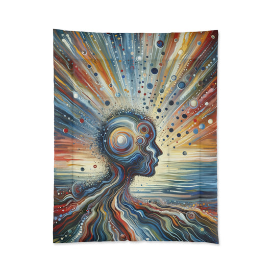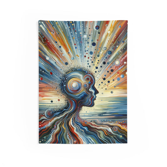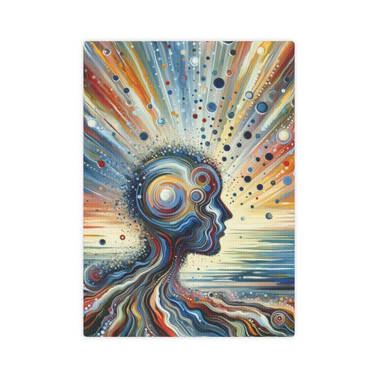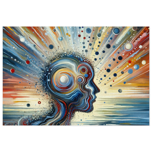 The image titled Conscious Ripple Influence is a striking vertical piece in the Tachism style, symbolically representing the ripple effect of conscious choices. At the heart of the composition is the silhouette of a human head profile facing to the left, formed by the convergence of dynamic, swirling lines and shapes that flow outward like waves of energy or water. These lines create a sense of motion, as if emanating from the mind and extending throughout the entire canvas. The colors used are vibrant and diverse, ranging from deep blues and soothing aquamarines to fiery reds, oranges, and warm yellows, with each hue delicately transitioning into the next. The background suggests a cosmic sky or deep sea with these rippling effects that give a feeling of expansion and interconnection. Streaks of white and lighter shades suggest illumination or enlightenment, emphasizing the impact of thoughtful decisions on both the individual and the world around them. Dotted with circular forms that resemble droplets or celestial bodies, the artwork captures the essence of ideas or actions spreading out and influencing everything they touch. The painting is a meaningful visual metaphor for the concept of cause and effect, illustrating how personal awareness and intention can propagate through a continuous, expanding network of outcomes, symbolizing the power of human consciousness to shape reality.