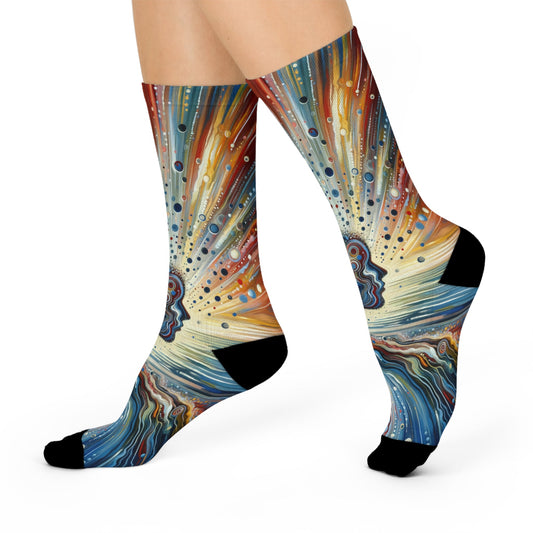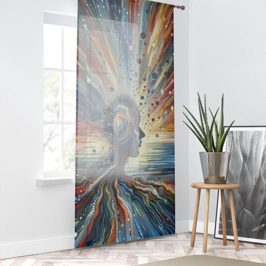 The image titled Conscious Ripple Influence is a striking vertical piece in the Tachism style, symbolically representing the ripple effect of conscious choices. At the heart of the composition is the silhouette of a human head profile facing to the left, formed by the convergence of dynamic, swirling lines and shapes that flow outward like waves of energy or water. These lines create a sense of motion, as if emanating from the mind and extending throughout the entire canvas. The colors used are vibrant and diverse, ranging from deep blues and soothing aquamarines to fiery reds, oranges, and warm yellows, with each hue delicately transitioning into the next. The background suggests a cosmic sky or deep sea with these rippling effects that give a feeling of expansion and interconnection. Streaks of white and lighter shades suggest illumination or enlightenment, emphasizing the impact of thoughtful decisions on both the individual and the world around them. Dotted with circular forms that resemble droplets or celestial bodies, the artwork captures the essence of ideas or actions spreading out and influencing everything they touch. The painting is a meaningful visual metaphor for the concept of cause and effect, illustrating how personal awareness and intention can propagate through a continuous, expanding network of outcomes, symbolizing the power of human consciousness to shape reality.