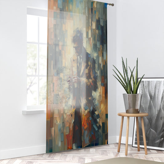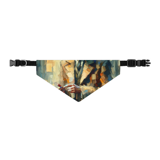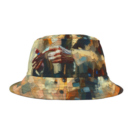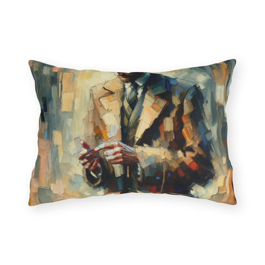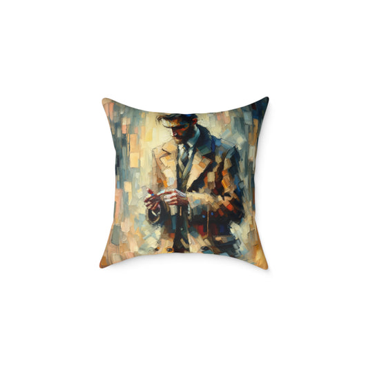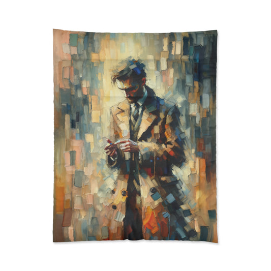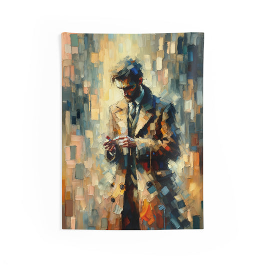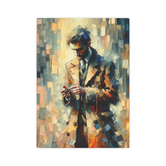 The image titled Urban Tachism Encounter depicts a figure that appears to be a man dwarfed within a vibrant mosaic of abstract, Tachist-style brushwork. The man, poised at the center of the composition, exudes an air of introspection and subtle movement. His stance is casual yet concentrated, with his hands busily engaged in front of him, suggesting an interaction with a small object that remains imperceptible to us. The painting evokes the essence of an urban setting through a masterful array of colors and shapes, conjuring thoughts of hazy cityscapes or the glow of lights upon glass and metal. The background bathes the figure in a kaleidoscope of warm and cool hues, ranging from soft pastels to vigorously applied dark tones. This backdrop seems to symbolize the frenetic energy and anonymity of city life, yet it also frames the subject in a moment of private solemnity. The figure himself is rendered with thick, deliberate strokes of paint, crafted in a manner that both blends with and stands out from the environment. His clothing suggests practicality, with the textures and layers, possibly of a well-worn coat, rendered in a patchwork of contrasting shades. The man s posture and deep absorption in his activity suggest a narrative, inviting viewers to ponder what thoughts or concerns occupy his mind as he navigates the colorful chaos surrounding him.