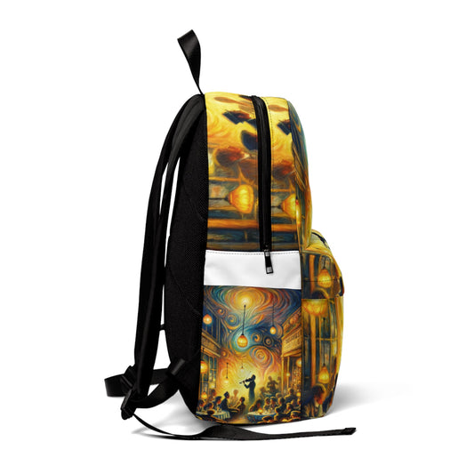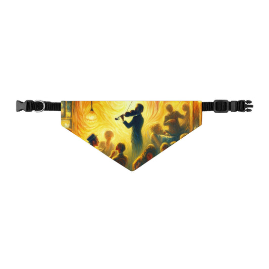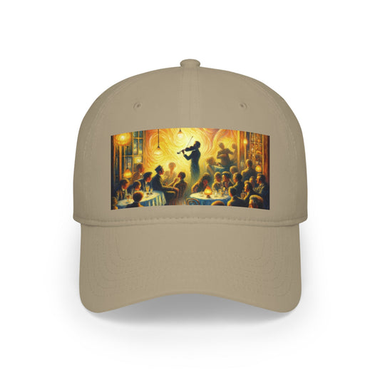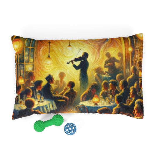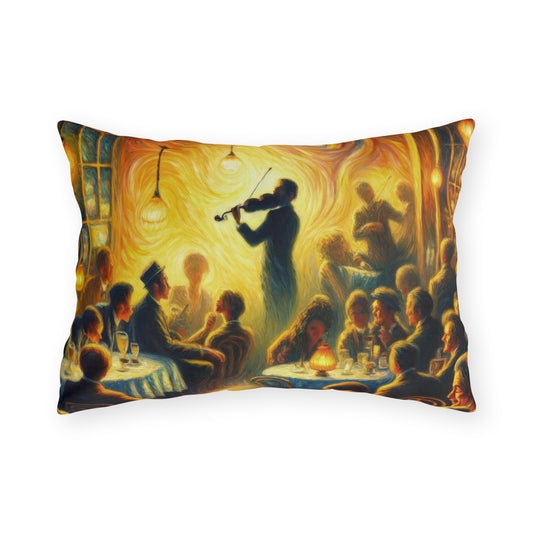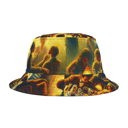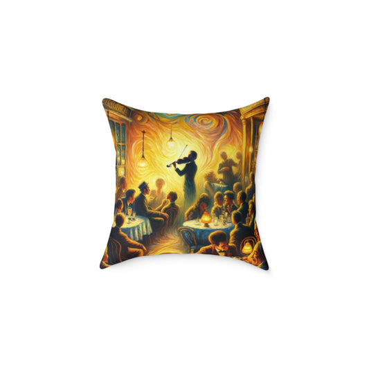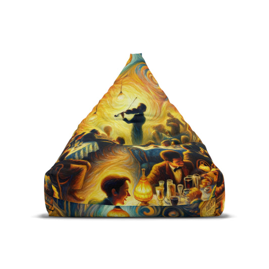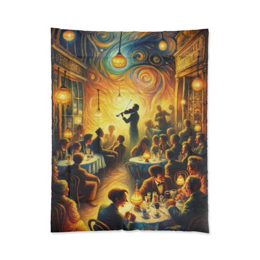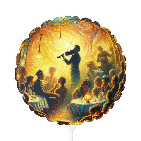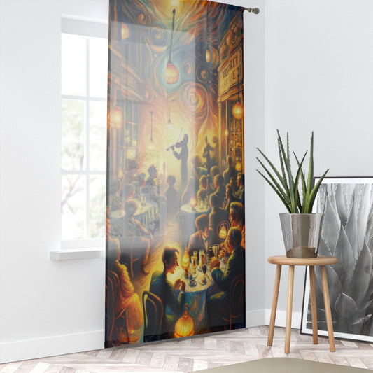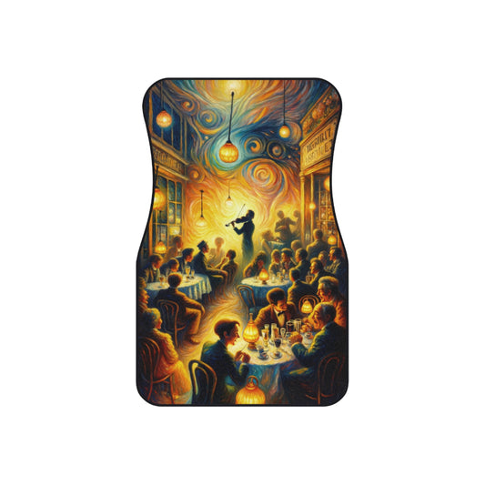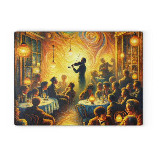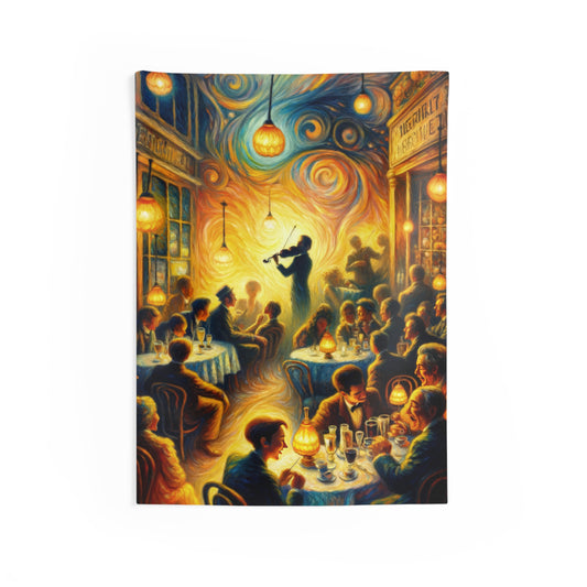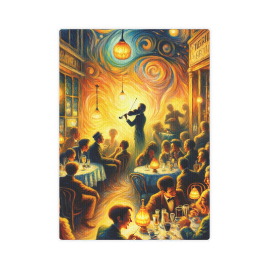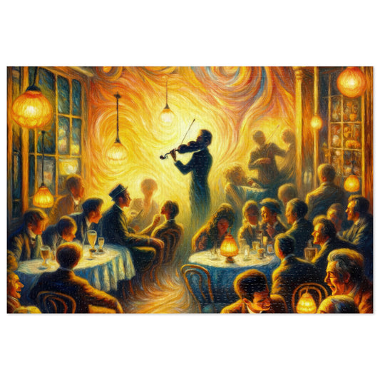 Bistro Emotive Entry is an evocative vertical painting rendered in the Tachism style that symbolically captures the scene and emotions as Amelie enters a bistro. The artwork is imbued with a strong sense of mood and atmosphere, vividly conjuring the warmth and buzz of a sociable bistro scene. In the foreground, patrons are seated at tables cloaked in golden-yellow light, their forms and faces blending softly into one another. Each table glows with its own orb-like lamp, casting a cozy and inviting light on the proceedings. The diners appear engaged in lively conversation or contemplation, with glasses and cups on their tables suggesting an evening of leisure and refreshment. At the heart of this luminous setting stands a violinist, filling the bistro with music. Like a beacon, the musician s silhouette is backlit by the swirling patterns of light and shadow that evoke the feeling of sound waves emanating outwards. The energy and movement of the brushstrokes around the violinist create a visual symphony that weaves through the entire composition. The ceiling swirls with a celestial dance of colors, reminiscent of the night sky, adding a dreamlike quality to the scene. Through the window, the outside world is hinted at, but it is the warmth and vibrancy inside that captivates the viewer. Words on the glass door appear to echo the name of the establishment or perhaps an invitation to the experience within, further enhancing the sense of place