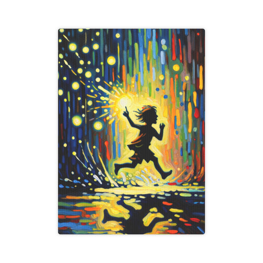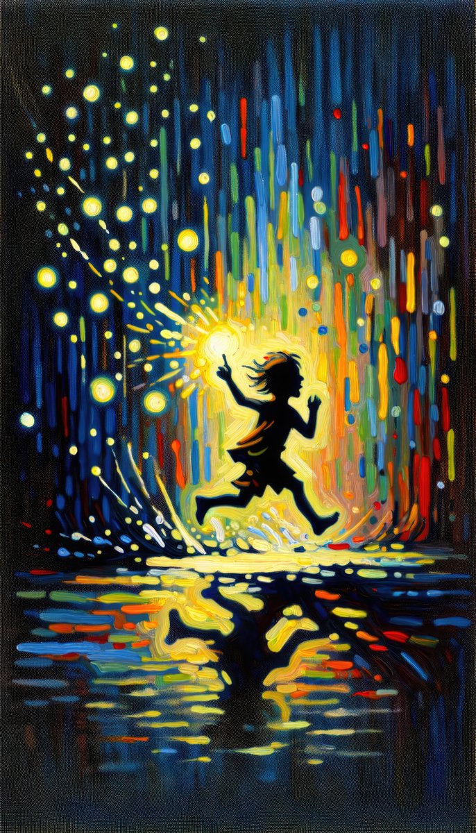 The image titled Child Firefly Chase is a vibrant, vertical canvas painted in the Tachism style. It symbolically represents a magical scene where a child, presumably no older than five, is in mid-chase after a firefly. This energetic artwork is composed of a cascade of colors ranging from deep blues and purples to glowing yellows and oranges, reminiscent of the twilight sky speckled with stars. The firefly s light is exaggerated, bursting into an array of dazzling warm hues, forming the most radiant spot in the painting, symbolizing the child s intense focus and joy in the pursuit. The child s silhouette is depicted in black, with outlines that give the impression of movement. The innocence and curiosity of youth are captured in the child s pose — arms outstretched and one foot lifted, signifying a playful leap forward. The energy and excitement of the chase are palpable. Surrounding the firefly and the child, there are numerous vertical and horizontal strokes, creating an energetic and abstract portrayal of the environment. These strokes mimic the natural chaos and randomness of a meadow or forest at dusk, with light and color melting into each other giving an effect of motion and life. The reflection of the child and the firefly s glow is mirrored on the surface below, which may suggest water, adding a sense of depth and a contemplative dimension to the artwork. The reflection is slightly distorted, adding to the dreamlike, ephemeral quality of the scene