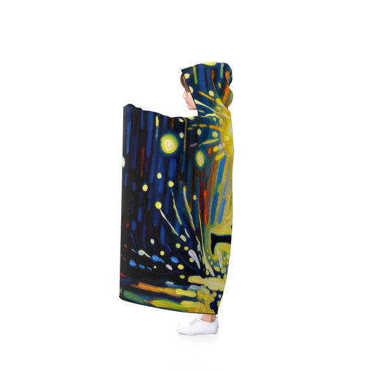 The image titled Child Firefly Chase is a vibrant, vertical canvas painted in the Tachism style. It symbolically represents a magical scene where a child, presumably no older than five, is in mid-chase after a firefly. This energetic artwork is composed of a cascade of colors ranging from deep blues and purples to glowing yellows and oranges, reminiscent of the twilight sky speckled with stars. The firefly s light is exaggerated, bursting into an array of dazzling warm hues, forming the most radiant spot in the painting, symbolizing the child s intense focus and joy in the pursuit. The child s silhouette is depicted in black, with outlines that give the impression of movement. The innocence and curiosity of youth are captured in the child s pose — arms outstretched and one foot lifted, signifying a playful leap forward. The energy and excitement of the chase are palpable. Surrounding the firefly and the child, there are numerous vertical and horizontal strokes, creating an energetic and abstract portrayal of the environment. These strokes mimic the natural chaos and randomness of a meadow or forest at dusk, with light and color melting into each other giving an effect of motion and life. The reflection of the child and the firefly s glow is mirrored on the surface below, which may suggest water, adding a sense of depth and a contemplative dimension to the artwork. The reflection is slightly distorted, adding to the dreamlike, ephemeral quality of the scene