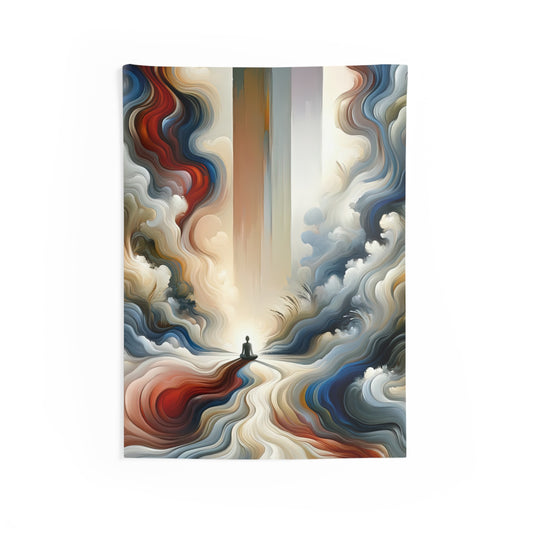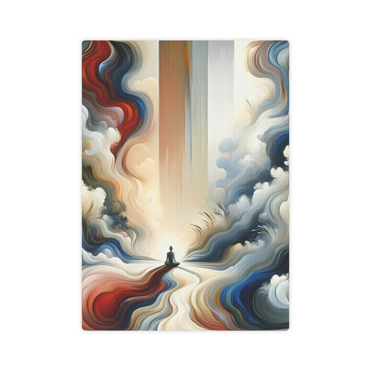Tranquil Haven Respite is an evocative Tachism style vertical painting that embodies the essence of finding peace amidst the chaos. At the heart of the composition is a lone figure sitting in meditation, embodying serenity. This figure is the anchor of the artwork, positioned at the convergence of swirling, dynamic contours of colors that seem to represent the tumultuous hustle of life. The painting features a mesmerizing blend of rich, warm hues and cool, calming tones, which flow around the central figure in a natural, wave-like fashion. The organic movement of the shapes and colors in the background suggests the undulating rhythms of existence. Dominant colors range from deep blues and moody grays to vibrant oranges and soothing creams, creating a captivating visual journey with an impression of depth and movement. The contrasting bold vertical lines slice through the fluidity of the forms, symbolizing the unwavering strength and stillness one can achieve in their chosen haven. These vertical elements stand as pillars of stability against the soft, curving edges of the abstract forms. This visual representation speaks to the viewer, inviting them to take a moment to call a truce with the hustle of life, offering a visual sanctuary where the observer can contemplate and find balance within themselves. The underlying message is clear: amidst the swirling chaos of life, it is possible to find a tranquil haven for respite.