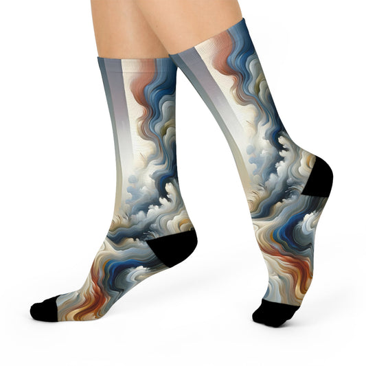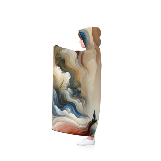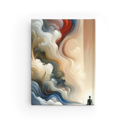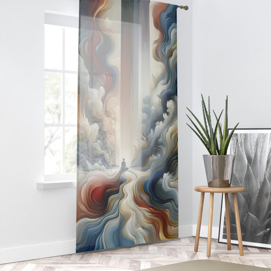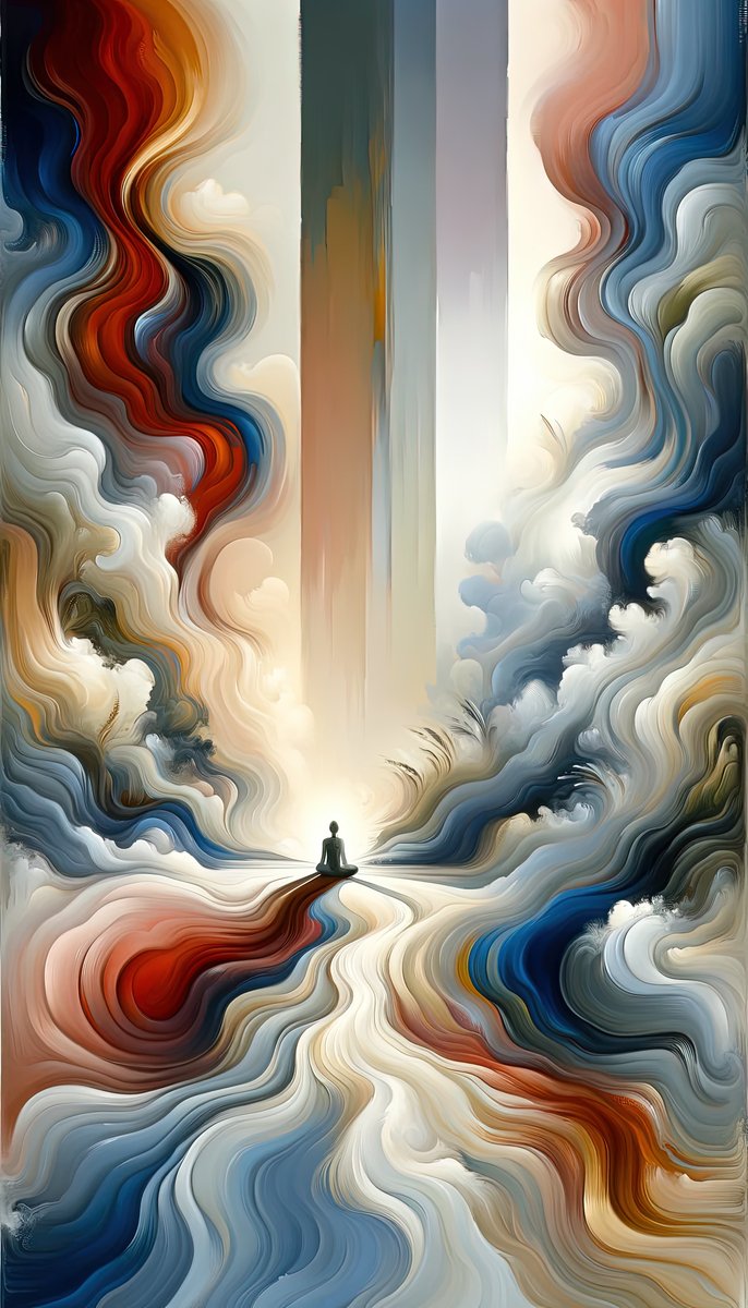 Tranquil Haven Respite is an evocative Tachism style vertical painting that embodies the essence of finding peace amidst the chaos. At the heart of the composition is a lone figure sitting in meditation, embodying serenity. This figure is the anchor of the artwork, positioned at the convergence of swirling, dynamic contours of colors that seem to represent the tumultuous hustle of life. The painting features a mesmerizing blend of rich, warm hues and cool, calming tones, which flow around the central figure in a natural, wave-like fashion. The organic movement of the shapes and colors in the background suggests the undulating rhythms of existence. Dominant colors range from deep blues and moody grays to vibrant oranges and soothing creams, creating a captivating visual journey with an impression of depth and movement. The contrasting bold vertical lines slice through the fluidity of the forms, symbolizing the unwavering strength and stillness one can achieve in their chosen haven. These vertical elements stand as pillars of stability against the soft, curving edges of the abstract forms. This visual representation speaks to the viewer, inviting them to take a moment to call a truce with the hustle of life, offering a visual sanctuary where the observer can contemplate and find balance within themselves. The underlying message is clear: amidst the swirling chaos of life, it is possible to find a tranquil haven for respite.