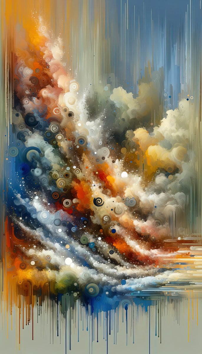 Titled Crescendo Duration Symphony, this vertical image is a dynamic and colorful representation in the Tachism style, symbolizing the concept of The Crescendo of Duration. The artwork features an interplay of hues and shapes that visually depict the idea of a crescendo, a gradual increase in loudness or intensity in music, as it relates to the passage of time. The composition utilizes a palette ranging from warm oranges and reds to cool blues and whites, suggesting a transition from energetic, fiery moments to calm, serene phases. Swirling patterns, dots, and concentric circles converge towards the central part of the canvas, creating a sense of movement and rhythm. These elements could be interpreted as representing the beats and notes of a symphony, each contributing to the overarching theme of progression and growth. Vertical streaks of color flow downwards like rain, blending and blurring the boundaries of the forms, while simultaneously giving the piece a sense of gravity and grounding. This vertical movement contrasts with the explosive, outward motion at the center, emphasizing the theme of duration that expands and evolves over time. Overall, this artwork captures the essence of a crescendo in time and experience, weaving together a visual symphony of color and abstract forms that engage the viewer in a contemplative narrative of growth, intensity, and the profound beauty of enduring progressions.