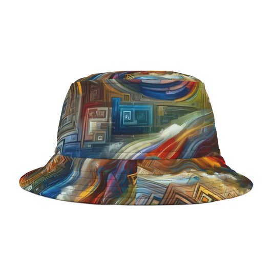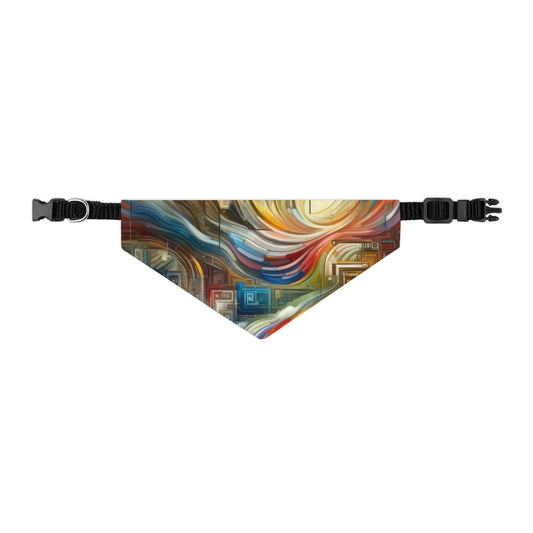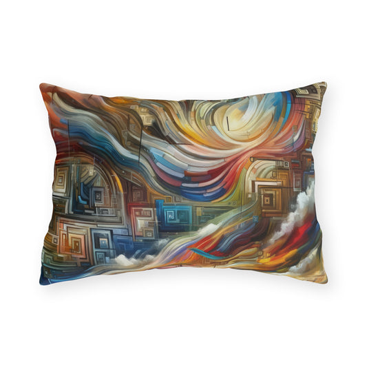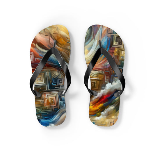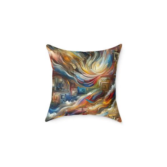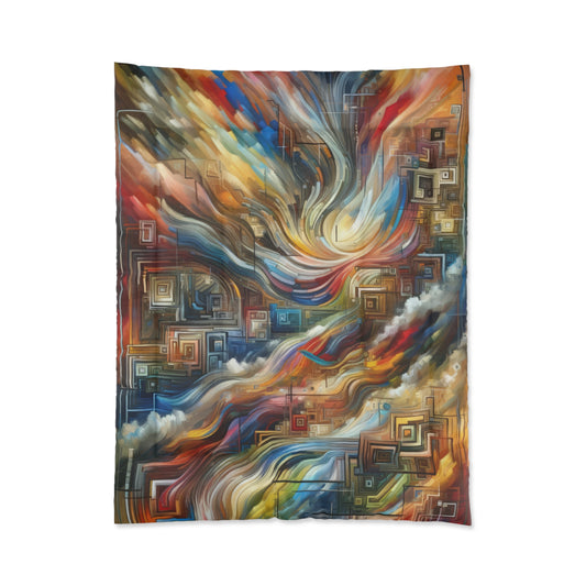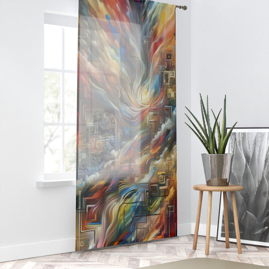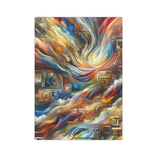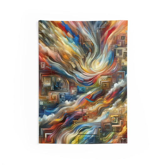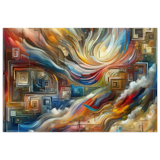 The image titled Woven Progress Tapestry is a vibrant vertical Tachism style painting that depicts an abstract impression of the threads of a tapestry woven into the larger narrative of progress . This expressive artwork is awash with a riot of swirling colors and dynamic brushstrokes that convey movement and energy. Against this kaleidoscopic backdrop, geometric forms reminiscent of stylized Greek keys or labyrinth patterns emerge, some crisply defined and others more subtly integrated into the flowing color fields. The colors span the full spectrum, with vivid reds, deep blues, sunny yellows, and earthy browns all intermingling, lending the composition a feeling of diversity and complexity. In certain areas, the shapes coalesce into dense clusters of lines and rectangles, suggesting concentrated nodes of activity or pivotal moments that stand out in the fabric of history. While other sections seem to ripple and fade into the surrounding hues, these could represent the interconnected yet often indistinct occurrences that comprise our collective journey. Overall, the piece captures the essence of progress as a multifaceted and intricate process, weaving together the individual threads of human experience into a broader, ever-evolving story. The painting s dynamic nature and its textured, layered appearance evoke the chaos and order that characterize the march of time and the unfolding of civilization.