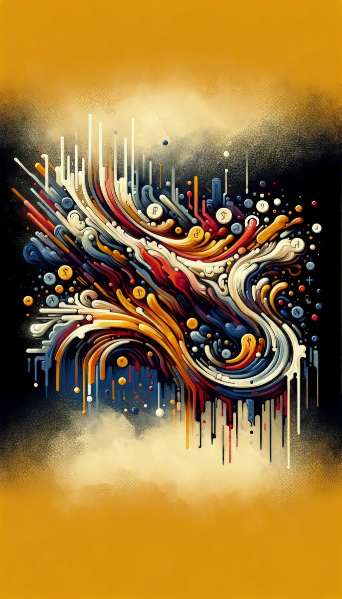 Abstract Financial Flux is an evocative vertical image rendered in a Tachist style, symbolizing the dynamic and complex concept of The Currency of Change . The artwork captures the abstract notion of financial movement and transformation through a rich tapestry of swirling colors and shapes. The image is dominated by a central, undulating mass of curving lines and forms, swirling with a sense of fluidity and motion that mimic the unpredictable nature of financial markets. Vivid hues of red, blue, orange, and white interlace with darker tones, all flowing against a contrasting background that shifts from a deep, cosmic black to a warm, gold-tinged amber. Symbolic of various currencies and economic elements, various circular icons adorned with currency symbols, such as the dollar, euro, and yen, are interspersed throughout the composition, suggesting an intricate dance of monetary exchange and the interconnectedness of global finance. Extending from this central array of colors and shapes are trails and dripping lines, creating an effect akin to paint running down a wall. These streaks add a sense of gravity and direction, indicating perhaps the influence of external factors on economic changes, and the downward or upward movement of market trends. The image balances chaos and order, embodying the unpredictable and ever-evolving essence of economic change—a visual metaphor for the tumult and constant flow of the financial world.