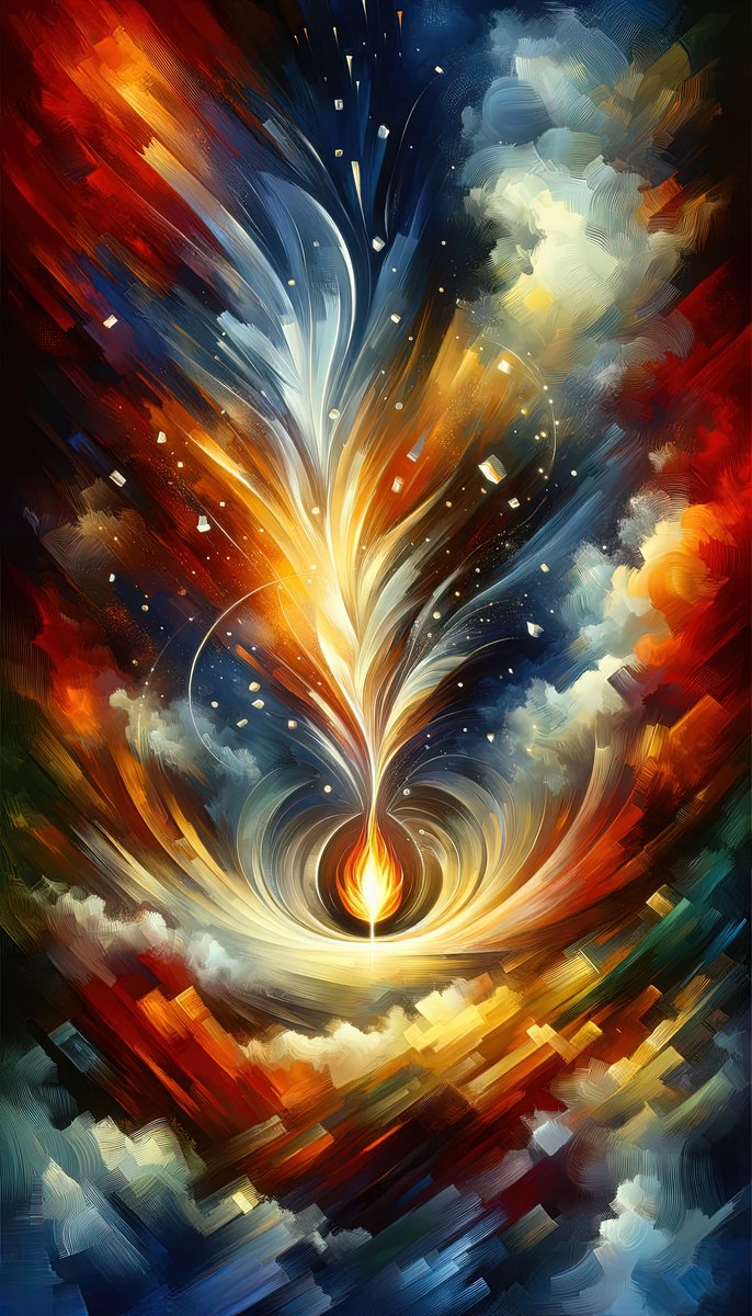 The image titled Igniting Transformational Currents is a striking vertical painting created in the Tachism style, an abstract art movement that emphasizes spontaneous brushwork, dripping, and the impression of action in the artwork. At the heart of this evocative piece is the theme of Sparking the Ember of Change, represented by a singular, glowing ember from which surges a dynamic array of flame-like forms. Vivid and contrasting colors emanate from the center, swirling upwards in a blend of warm and cool hues. Bright reds and oranges on the left side suggest intense heat and energy, intertwined with cooler blues and greys on the right that could signify calmness and rationality within the transformative process. The central figure-a fiery emblem is a clear focal point, seemingly igniting the surrounding landscape. Splashes of white dots and lines dance throughout the composition, reminiscent of sparks or stars, implying a celestial or otherworldly aspect to the painting. The texture and patterns created by the strokes convey movement and depth, giving the impression that the transformation depicted is not just a stagnant event but rather a powerful, ongoing surge. As a work of art, it captivates the viewer s imagination, allowing them to meditate on the continuous flux of change and the small moments that could lead to profound shifts in perception and reality.