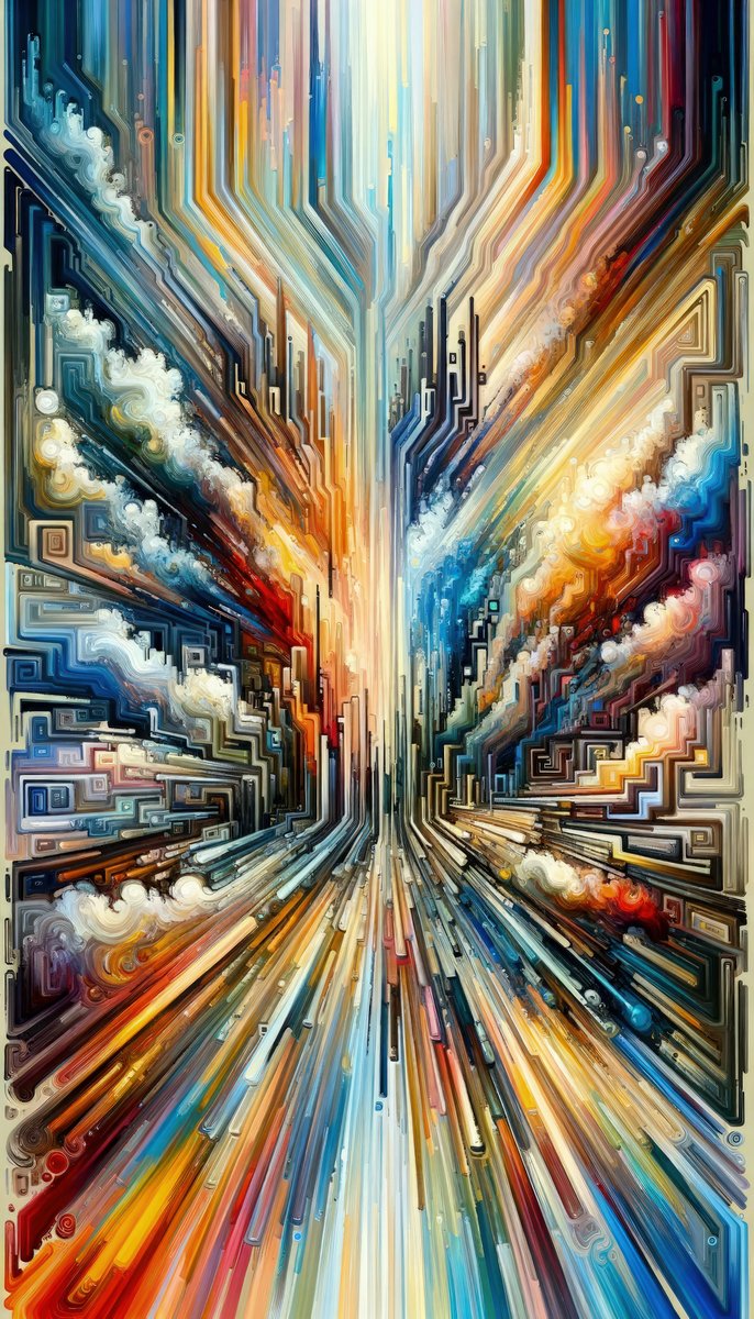 The image titled Transformative Tapestry Ascent is a vibrant vertical artwork that encapsulates the essence of transformation through a visual representation reminiscent of the Tachism art style. The composition is characterized by a dynamic confluence of elongated, multicolored strokes that extend upwards, converging towards a luminous, radiant point at the top, symbolic of an apex or a zenith in a transformative journey. This captivating array of colors ranges from warm tones of red, orange, and yellow near the bottom, evoking a sense of fiery energy and dynamism, to cooler shades of blue and white towards the top, suggesting ascent and transcendence. Swirling patterns that mimic clouds intermingle with the linear elements, adding a sense of organic fluidity, while geometric shapes reminiscent of technological or architectural structures lend a sense of order and progression. The intricate layering of colors and shapes produces an almost digital, pixelated effect, blending the organic with the synthetic, the emotional with the analytical. The image conveys a journey through change, each layer representing a step or phase towards a transformative goal. The interplay of light and shadow, the seamless blend of different elements, and the overall upward motion together create a sense of continuous movement, encouraging the viewer to consider their own path of personal or collective evolution.
