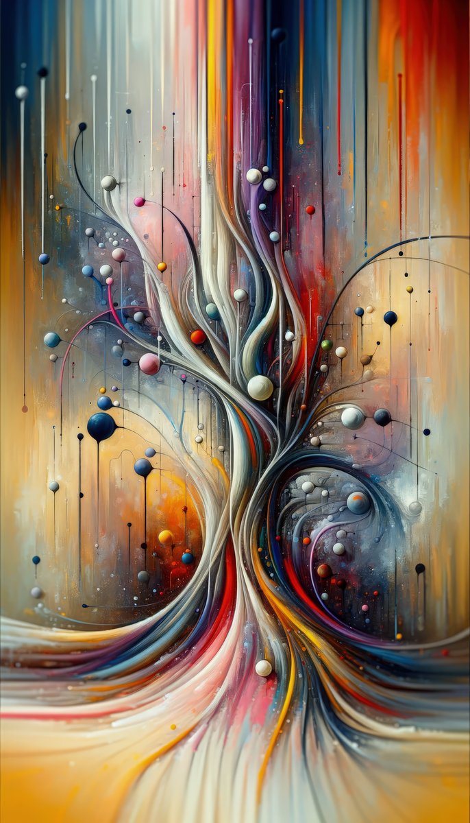 The image titled Invisible Threads Influence is a vertical Tachism style painting that symbolizes The Invisible Threads of Influence. This abstract art piece captures the essence of unseen connections, and it is rich in flowing organic lines and vibrant colors. Central to the artwork is a tree-like form composed of twisting and intertwining lines in shades of cream, white, grey, and beige, which branch out across the canvas. These lines suggest a dynamic movement, reminiscent of the intricacies of invisible influences in life. Dotted along these flowing lines and in the spaces between are multicolored spheres and orbs, evocative of nodes or junctures on the web of connections. The orbs appear suspended, with some connected by thin black filaments that give the impression of a network or a map of interactions stretching out. The background is equally striking, with vertical streaks of bold colors like orange, red, blue, and purple, which appear to be melting or dripping down the painting, exuding both warmth and depth. This background creates a sense of continuity against which the tree structure stands out. The rich texture, the variation in the sizes of the orbs, and the intricacies of the connecting lines all collaborate to create a visual allegory for the complex and invisible ways in which influence operates. Small flecks of paint and precise details within the piece contribute to its overall sense of kinetic energy and abstract symbolism.