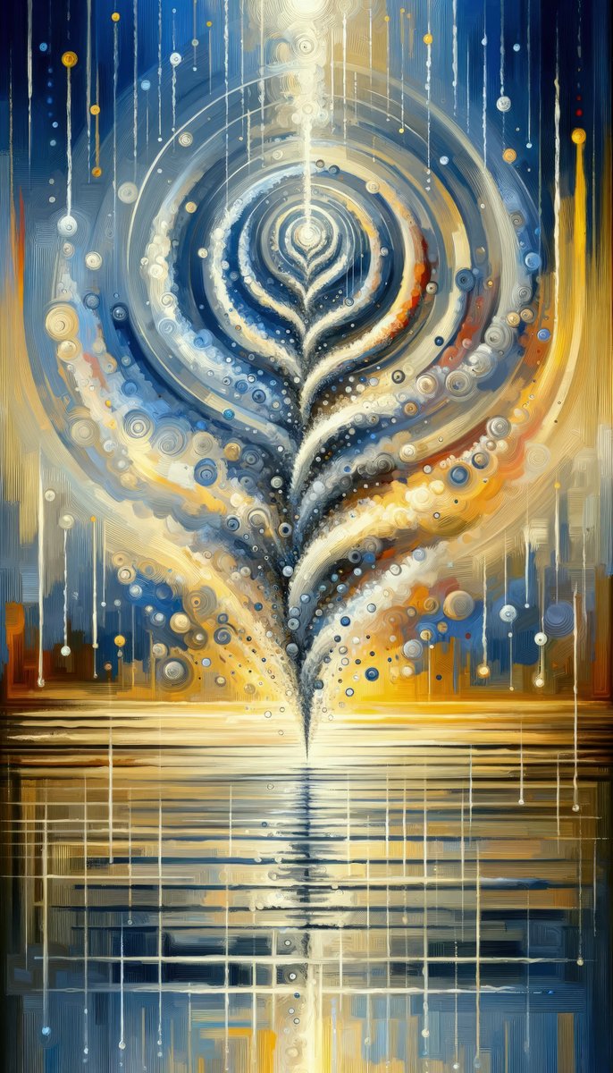 Titled Ripple Effect Abstraction, this painting is a captivating expression of the ripple effect model through Tachism, an abstract art movement characterized by spontaneous brushwork, drips, and blobs of paint. The work s vertical orientation serves as an intriguing canvas for the dynamic motions captured within. Central to the piece is a mesmerizing swirl of concentric circles radiating outwards, evoking the imagery of ripples in water. This spiral is rendered with a blend of blues, whites, and subtle hints of warmer hues, creating a sensation of depth and movement. Speckles and spirals of varying sizes and tonalities suggest an ever-expanding influence, encapsulating the essence of how a single action can propagate outward and affect a larger system. The background offers a stark contrast of vertical and horizontal elements, with drips of paint descending from above, possibly illustrating the intersection of different forces or energies. The rising and descending elements create a sense of fluid dynamics, as if energy or actions are transferring through different mediums. In its entirety, the work is rich in texture and emotional resonance, with its abstract forms and colors inviting viewers to contemplate the complex and interconnected reactions that unfold from simple disturbances in a harmonious system. Such a piece effortlessly embodies the theoretical concept it aims to represent, encouraging deep reflection on the cascading consequences of our actions in the world around us.