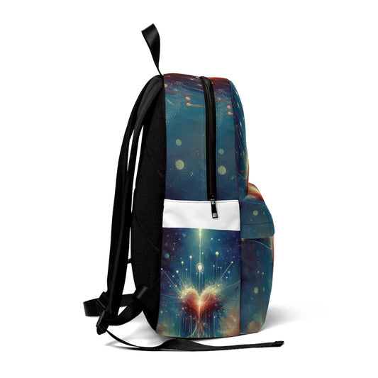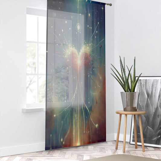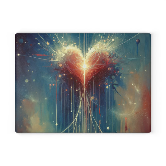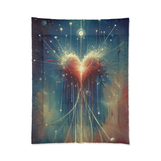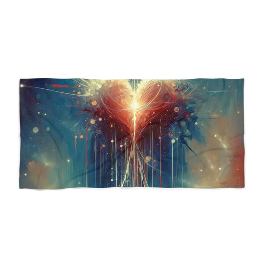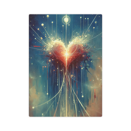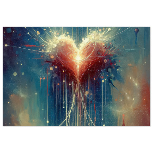 Transcendent Connection Beauty is a vertical image steeped in the Tachism style, symbolically representing the profound essence of connection and transcendence. At the core of the composition is a radiant heart, which appears to be both the source and the recipient of an array of ascending and descending light strands and orbs. These elements stretch outwards in an expression of dynamic interaction with the cosmos, evoking an ethereal tapestry where each thread and sphere contributes to an intricate celestial dance. The palette is rich with deep blues and bursts of white, imbuing the piece with a feeling of cosmic depth and mystery, while the heart glows with a warm, inviting light. Dappled with what could be interpreted as stars or distant galaxies, the background resonates with a sense of infinity, positioning the central motif as a nexus between the tangible and the intangible. This artwork seems to convey a powerful metaphor for the human condition—the heart at its center, anchored in emotional reality, while its connections reach for something greater, expressing a desire for spiritual ascension and unity. It is a captivating visualization of intangible connections that resonate with both sweetness and a boundless, otherworldly elegance.