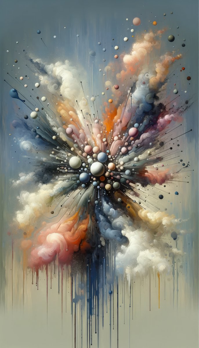 The image titled Impactful Deeds Ripple is a vertical display of expressive abstraction in the Tachism style. It presents a central burst of energy composed of spherical forms in a multitude of sizes and colors—from pastel pinks, blues, and whites, to vibrant oranges and dark, muted tones. These orbs give the impression of spreading outward from a dense core, reminiscent of an explosion or a high-impact event in slow motion. Around the spherical forms are fine, dark lines, which seem to trace the trajectories of smaller particles or droplets, leading the eye to believe they are moving at high velocity. The backdrop consists of varying shades of grey to pale blue, subtly allowing the vibrant explosion of color and form in the foreground to stand out dramatically. The bottom part of the piece is characterized by paint drips that flow downwards, bearing colors that match the orbs. These drips look like the rain of influence or consequences, visually metaphorical for the trickle-down effect of a significant deed. The artwork s concept—that even the smallest deeds can have a significant impact in the grand narrative—is symbolized through the radiating pattern of the spheres and their ensuing effects, which mimic ripples expanding in water. The visual representation captures the essence of a single moment s capacity to induce far-reaching waves of change.