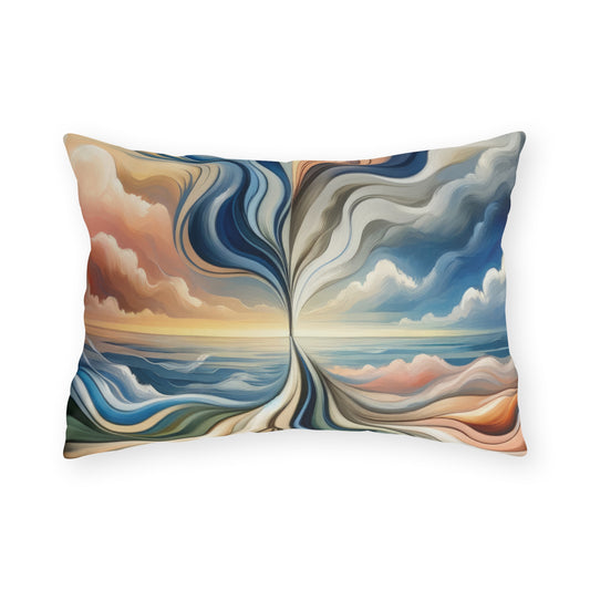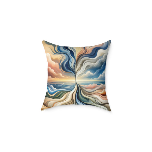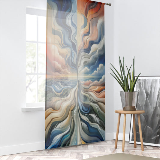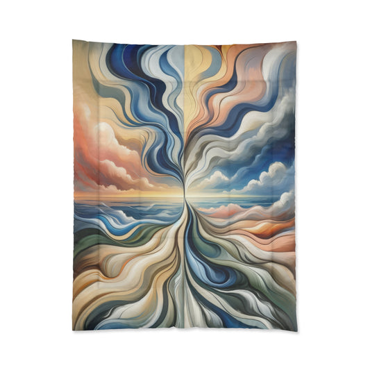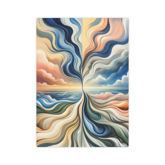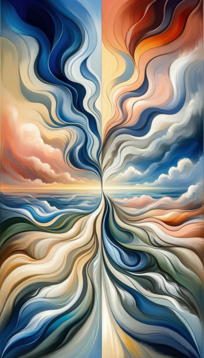Titled Tachism Confluence Harmony, this vertical painting is evocative of the Tachism art style, known for its spontaneous and non-geometric abstraction. The artwork depicts flowing forms that suggest a harmonious merging of two different entities. The composition is symmetrical across a central axis, with each side mirroring the other s dynamic patterns and shapes. On either side of the central divide, waves of color flow and swirl in a dance of love and respect. The left side is painted with cool hues of blue and grey, imbuing it with a serene and tranquil atmosphere, reminiscent of a deep and endless ocean. Transitioning from dark to light, the waves seem to represent the depth and layers of one s inner values and emotions. On the right side, warmer tones of orange, red, and beige evoke a sense of passion and warmth, implying the fiery essence of love and the nurturing spirit of respect. As the two sides approach the center, their individual patterns blend into a unified stream, symbolizing the interconnectedness of personal values with the broader fabric of shared human experience. The convergence culminates at the horizon line, where sky meets sea, reinforcing the idea that our personal paths contribute to the vast, collective journey of humanity. Overall, this Tachism style painting exudes a synergy between individuality and collectivism, urging viewers to reflect on how intrinsic values of love and respect allow personal growth to contribute positively to society at large.