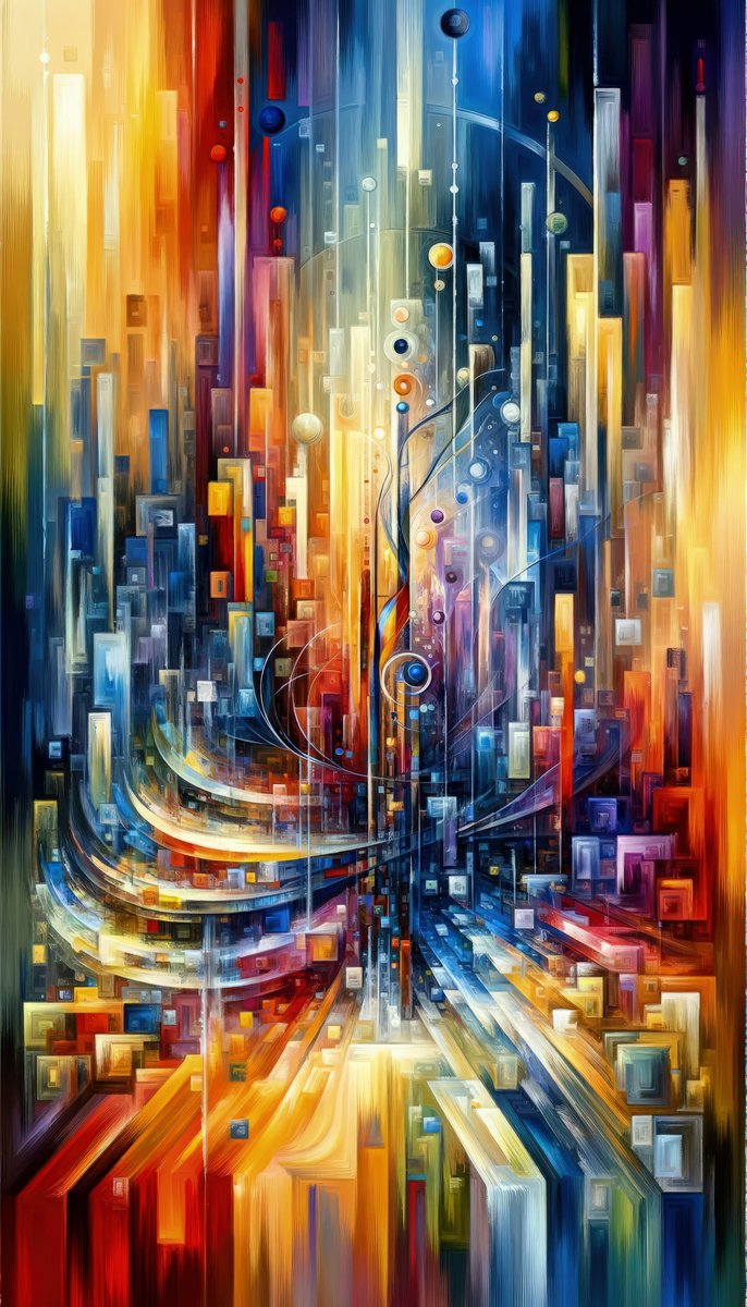 Symphonic Glass Resonance is a captivating vertical Tachism style painting that pulsates with the dynamic vitality of a live symphony. The artwork is ablaze with streaks of vibrant color that span across the canvas, reminiscent of sound waves flowing from the resonant vibrations of an orchestra. Vivid reds, blues, yellows, and oranges converge and diverge in a mosaic of musical motion. Contrasts of light and dark, warmth and coolness play across the piece, suggesting the ebb and flow of musical movements, from the softest legato to the most intense crescendo. The vertical orientation and the illusion of movement hint at the notion that if a single note can shatter a glass, a full symphony, with its harmonious rhythms of evening, could have a profound effect. Amid the blocks and rectangles that mimic the resonance of sound within a space, one can imagine the notes hanging in the air, causing a visual vibration that almost seems to shake the canvas. Occasional spherical shapes, like bubbles, rise through the geometric landscape, perhaps symbolizing the fleeting moments when a note reaches its peak before dissipating into silence. This piece encapsulates the powerful essence of symphonic music with a visual spectacle that resonates not just with the sight but also with the soul.