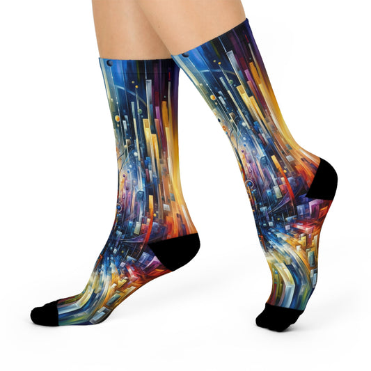 Symphonic Glass Resonance is a captivating vertical Tachism style painting that pulsates with the dynamic vitality of a live symphony. The artwork is ablaze with streaks of vibrant color that span across the canvas, reminiscent of sound waves flowing from the resonant vibrations of an orchestra. Vivid reds, blues, yellows, and oranges converge and diverge in a mosaic of musical motion. Contrasts of light and dark, warmth and coolness play across the piece, suggesting the ebb and flow of musical movements, from the softest legato to the most intense crescendo. The vertical orientation and the illusion of movement hint at the notion that if a single note can shatter a glass, a full symphony, with its harmonious rhythms of evening, could have a profound effect. Amid the blocks and rectangles that mimic the resonance of sound within a space, one can imagine the notes hanging in the air, causing a visual vibration that almost seems to shake the canvas. Occasional spherical shapes, like bubbles, rise through the geometric landscape, perhaps symbolizing the fleeting moments when a note reaches its peak before dissipating into silence. This piece encapsulates the powerful essence of symphonic music with a visual spectacle that resonates not just with the sight but also with the soul.
