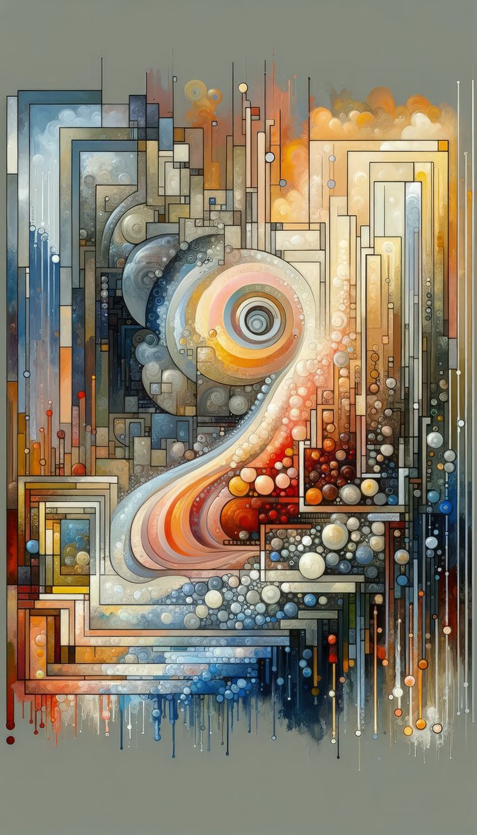 Titled Incrementalism Anthem Unity, this vertical artwork embodies the Tachism style, symbolically depicting the concept of Incrementalism: The Unsung Anthem of Unity. The image is an eclectic array of geometric and organic shapes, textures, and a rich palette of colors that blend together in a harmonious composition. On one side of the canvas, there is a conglomeration of rectangles, squares, and other angular forms, suggesting a cityscape or a complex architectural structure. These shapes feature a variety of subdued grays, blues, and earth tones accented with sporadic, vibrant highlights. Dominating the central portion of the image is a sweeping, wave-like form that cuts a sinuous path through the composition. It is comprised of concentric circles and painterly swirls that shift in color from a warm, sandy beige to a rich cascade of reds and oranges, implying energy and movement. This central element seems to represent unity in its flowing, unifying gesture, uniting the various components of the piece. The remainder of the space is filled with a variety of circles and dots, scattering across the image like a constellation of stars or a cluster of cells under a microscope. Colors transition from cool blues and greens to warmer hues, creating a sense of depth, and the drips that extend from these elements suggest a dynamic, fluid process of creation and growth. The intricate layering and the shifts in texture and form across the artwork articulate the principle of incremental progress