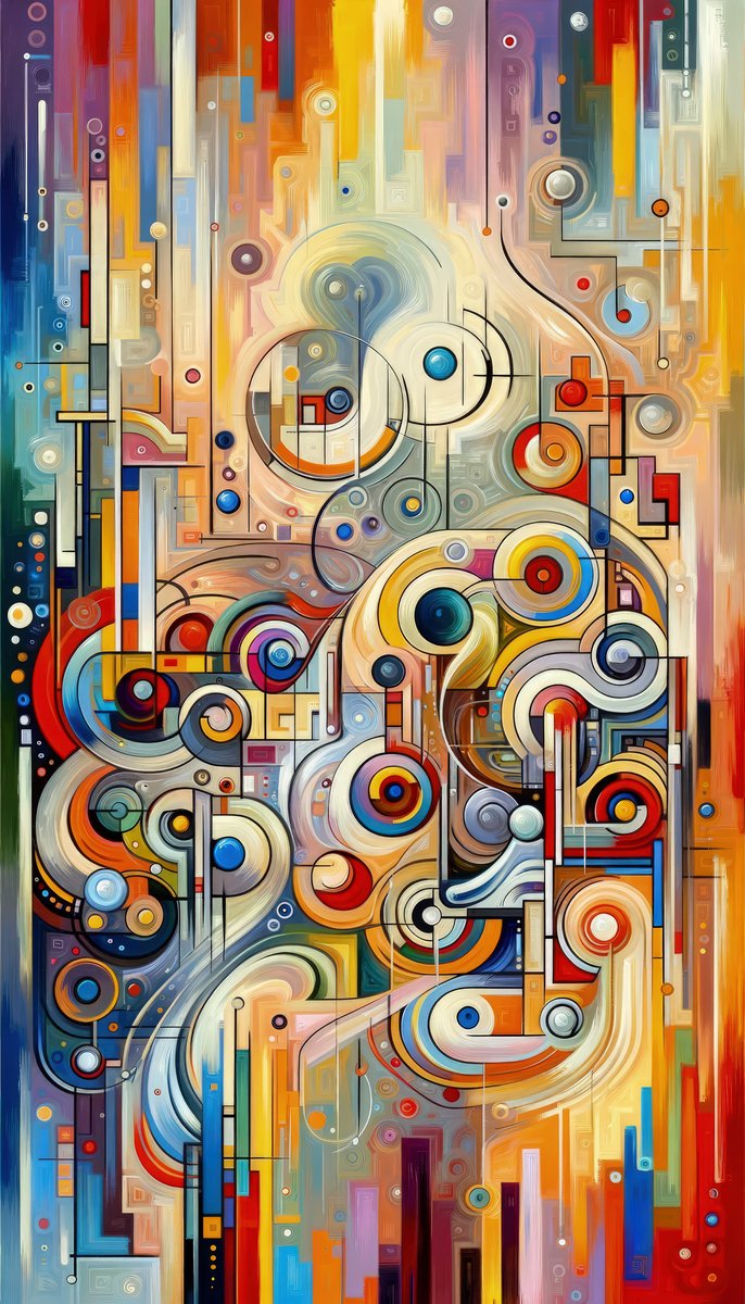 The image titled Playful Wisdom Essence is a vibrant Tachism style painting that bursts with energy and color. This vertical artwork is a visual symphony of abstract forms and swirling patterns that come together to symbolize an approach to life that is both playful and wise, with a keen embrace of experiences. At a casual glance, the canvas seems to be alive with circular motifs and organic shapes that flow like currents across the painting, drawing the eye in a dance around the piece. Warm and cool hues mingle in a carefully balanced palette, creating depth and contrast as they shift from soothing blues and calming greens to energetic reds, oranges, and yellows. The composition is a mix of precision and spontaneity, with clearly defined lines and geometric structures intersecting with the freer, more fluid elements. Circles of varying sizes, some concentric, seem to suggest the idea of cycles and the dynamic nature of life, while squares and rectangles ground the piece with a sense of stability. Linear elements, what appear like precise drips and elongated shapes, establish a rhythm and a sense of direction, leading the viewer s gaze throughout the canvas. Some sections of the painting exhibit a pixel-like granularity, adding a texture that contrasts with the smoother, broader areas of color. This painting captures the essence of playful wisdom with an inviting chaos that is tempered by a thoughtful composition, inviting viewers to reflect on the joyful complexities of life.