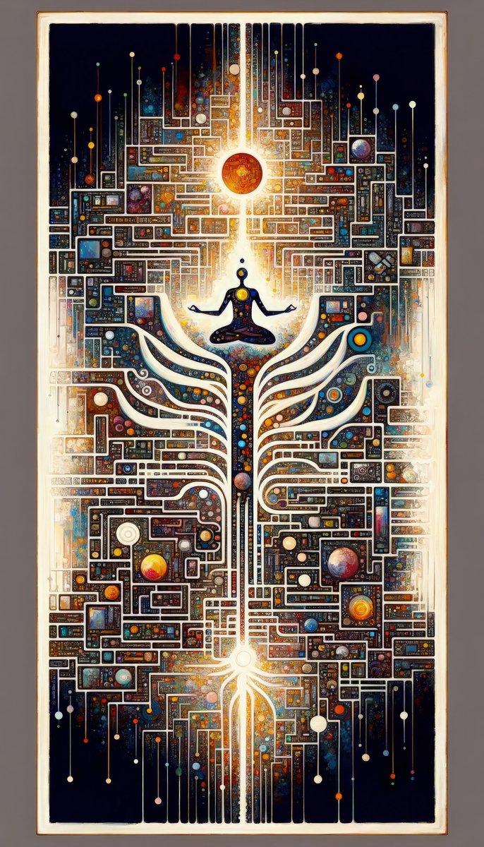The image titled Syncing Silicon Spirituality is a vertical composition rendered in a style reminiscent of Tachism, blending abstraction with intricate details. At the heart of this artwork, a silhouetted human figure sits in a meditative pose, its form merging seamlessly with the lines and structures that form a pair of expansive, wing-like patterns extending outward. Symbolic of the connection between humanity and technology, the figure serves as a nexus point where spirituality intersects with the silicon of circuitry. Around the central figure, the composition is rich with electronic circuitry motifs: a dense lattice of motherboards, processors, and interconnected pathways that evoke a sense of complex digital networks. Within this technological tapestry, celestial bodies such as planets and stars are scattered throughout, suggesting a cosmic scale, and perhaps the infinite potential of a harmonious relationship between our inner selves and digital advancements. A bright circular form above the meditator s head evokes the sun or a radiant enlightenment, further accentuating the theme of unity. The overall effect of the image is one of harmony and integration. The use of golds, browns, and dark blues, alongside the glowing points of light and cosmic imagery, imbues the piece with a mystical quality. It suggests an envisioned future or ideology where spiritual growth and technological progress are in sync, pointing towards a path forward that honors and merges these traditionally separate realms.