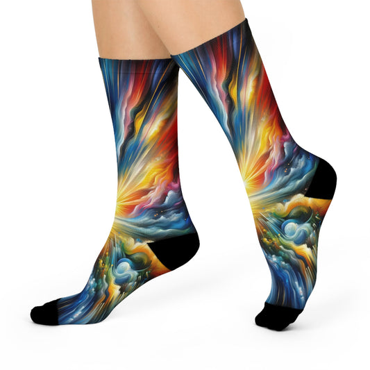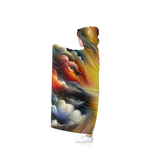 The painting titled Dawn New Consciousness is a captivating and vibrant composition symbolizing the awakening of a new state of awareness. Rendered in a vertical Tachism style, an abstract art form characterized by the spontaneous and intuitive application of vigorous, sweeping brushstrokes, the artwork pulses with energy and movement. The central focal point, a brilliant radiant sunburst, signifies the literal and metaphorical dawn, condensing the power and potential of this nascent consciousness within its blinding core. Around the sun, dynamic waves of color sweep across the canvas in a cosmic dance, reflecting the tumultuous yet harmonious nature of enlightened understanding. Shimmering hues of blue, red, orange, and yellow blend and contrast, creating a visual symphony that is at once chaotic and serene. The fluidity of the forms suggests a formlessness that is inherent to newly realized perspectives, where old constructs yield to infinite possibilities. The lower portion of the piece is reminiscent of a tumultuous sea, denoting the undercurrent of previous states of consciousness—deep, mysterious, and unexplored—challenging and supporting the emergence above. The art captures the essence of an evolutionary leap in thought and spirit, a revolution that bursts forth with breathtaking clarity, illuminating the path to enlightenment and the unfurling of the human spirit in its relentless pursuit of understanding.