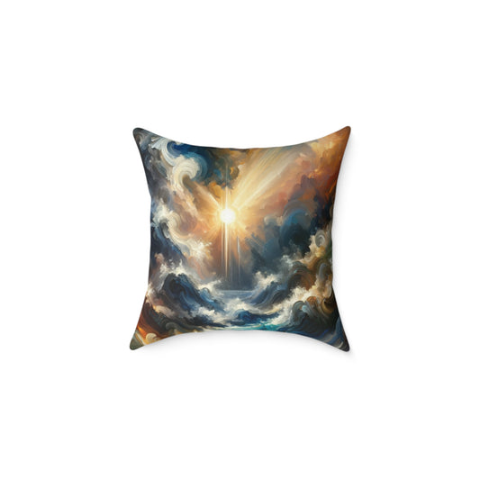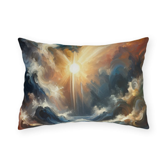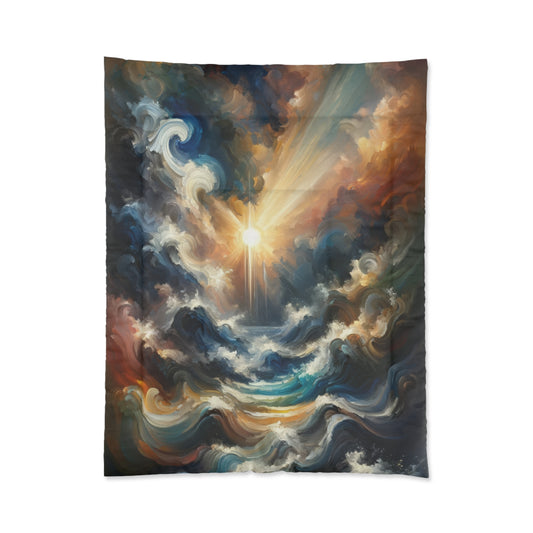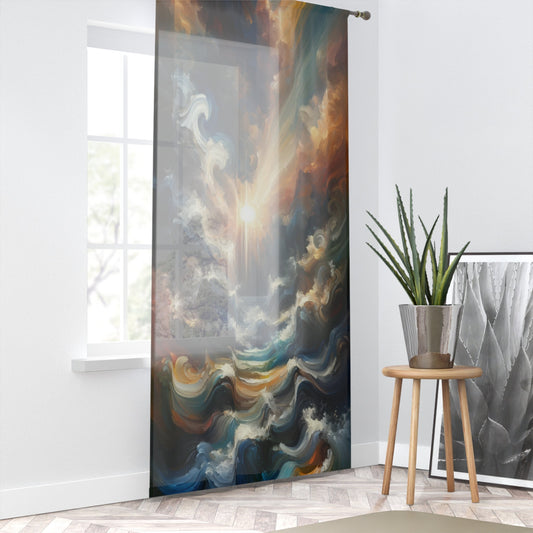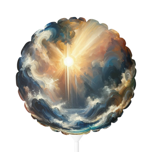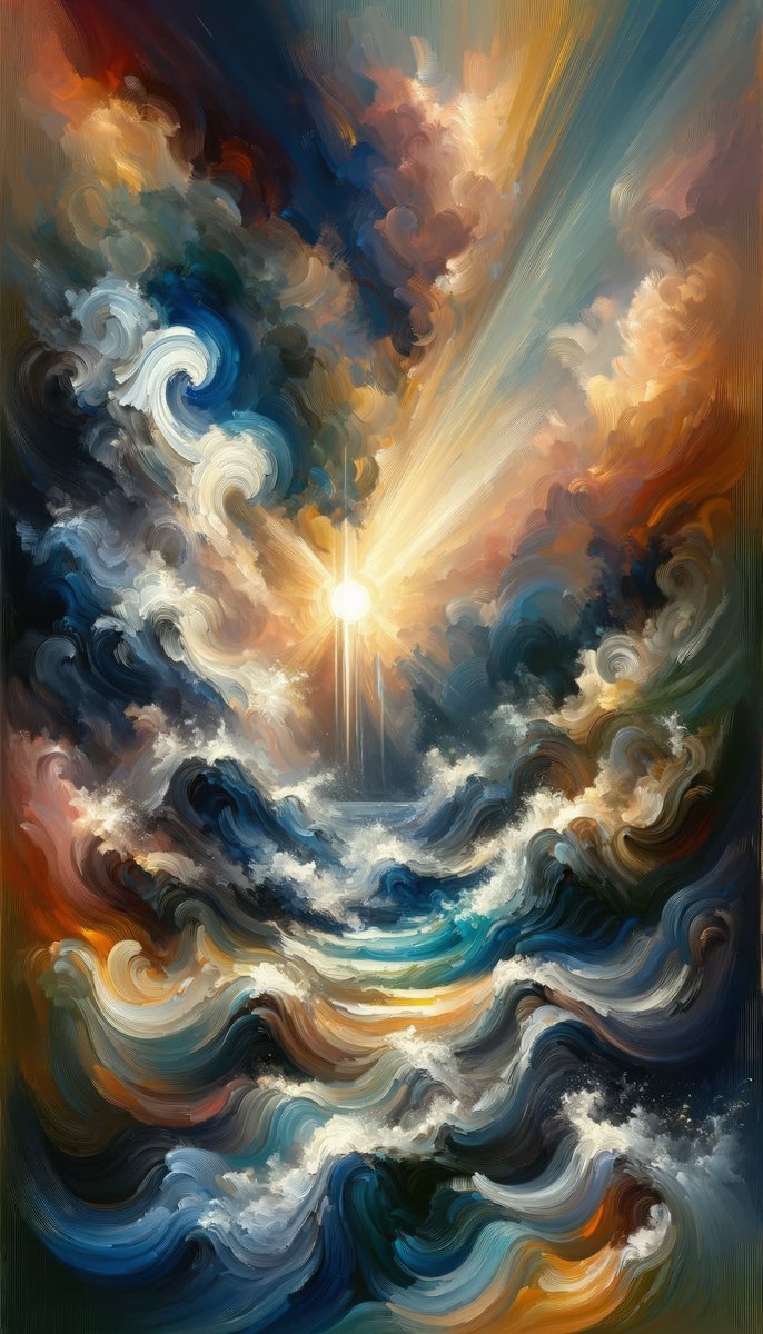 The image titled Tumultuous Sea Enlightenment is a vertical Tachism style painting that vividly portrays an abstract and powerful depiction of a restless sea and a steadfast spirit. At the center of this evocative composition, a radiant sun pierces the tumult, casting beams of light through the dynamic play of color and form, suggesting the invigorating force of enlightenment breaking through the chaos. Swell after swell of towering waves, rendered with energetic and swirling brushstrokes, surge and collide against each other, with crests of white foam highlighting their fierce interplay. The color palette is both contrasting and harmonious, featuring dark and moody blues representing the relentless depths, intertwined with gentle pastels transitioning into warmer hues, echoing the emergence of clarity and hope amidst the storm. The sky above mirrors the ocean s drama. Brooding dark clouds, expressed with thick impasto techniques, grapple with brighter, softer forms bathed in light, reflecting an internal struggle between doubt and understanding, darkness and illumination. The sun, a central and intense beacon of white light, extends upward and outward, suggesting the ultimate triumph of the spirit s resilience over the uncertainty symbolized by the undulating sea. The painting s overall effect is a deep-touching exploration of human emotion — a symbolic journey from inner turmoil to the awakening of the spirit, capture in the sublime dance of light and shadow, texture, and movement.