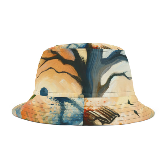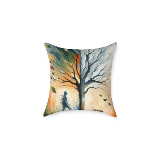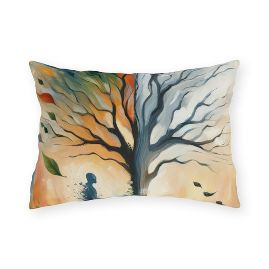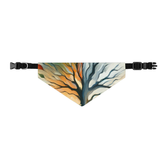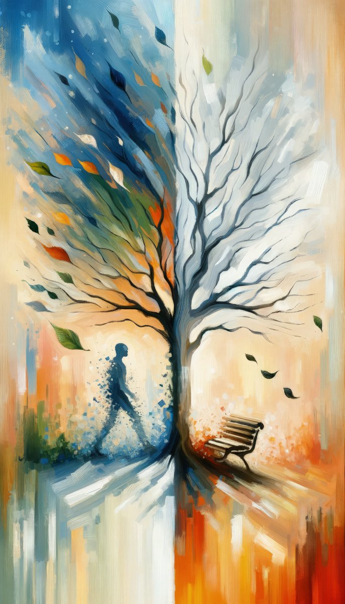 Transient Essence Anchored is a captivating vertical painting executed in the Tachism style. The central theme explores the juxtaposition of impermanence versus stability, expressed through the metaphor of a wayward leaf contrasted against the sturdy trunk of a tree. The canvas is dominated by a magnificent tree that splits the composition into two distinct realms. Its powerful, undulating trunk is displayed in stark white, anchoring the visual field firmly within the earth. From this trunk, a myriad of branches fan out, bare yet majestic in their spread. On one side, the palette is cool, with soothing blues and the soft haze of indigo, suggesting a calm, serene environment. Leaves in various autumnal shades—burnt oranges, fiery reds, and gentle yellows—appear carried by an invisible wind, symbolizing the transient and unpredictable nature of life. In stark contrast, the other side radiates with the warmth of golden and orange tones, resonating with a sense of enduring, vibrant energy. The ground mirrors the dichotomy above, painted with strokes that suggest fallen leaves and the ebb and flow of time. The presence of a solitary bench beneath the tree adds a human element of contemplation and connection. A shadowy figure appears to be walking away, dissolving into a cascade of blue shapes, further emphasizing the fleeting nature of existence. This figure could be interpreted as the wayward leaf, embarking on an uncertain journey away from the sturdy trunk, which confidently