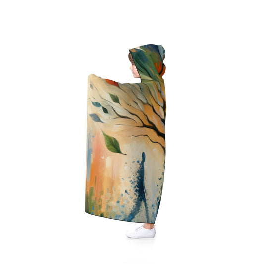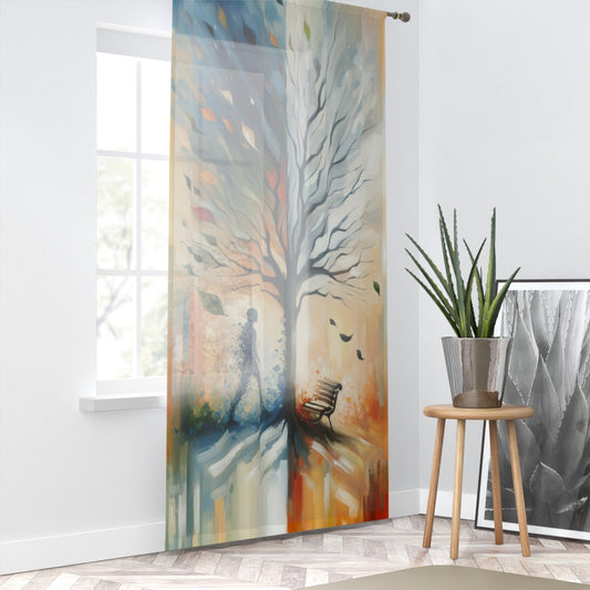 Transient Essence Anchored is a captivating vertical painting executed in the Tachism style. The central theme explores the juxtaposition of impermanence versus stability, expressed through the metaphor of a wayward leaf contrasted against the sturdy trunk of a tree. The canvas is dominated by a magnificent tree that splits the composition into two distinct realms. Its powerful, undulating trunk is displayed in stark white, anchoring the visual field firmly within the earth. From this trunk, a myriad of branches fan out, bare yet majestic in their spread. On one side, the palette is cool, with soothing blues and the soft haze of indigo, suggesting a calm, serene environment. Leaves in various autumnal shades—burnt oranges, fiery reds, and gentle yellows—appear carried by an invisible wind, symbolizing the transient and unpredictable nature of life. In stark contrast, the other side radiates with the warmth of golden and orange tones, resonating with a sense of enduring, vibrant energy. The ground mirrors the dichotomy above, painted with strokes that suggest fallen leaves and the ebb and flow of time. The presence of a solitary bench beneath the tree adds a human element of contemplation and connection. A shadowy figure appears to be walking away, dissolving into a cascade of blue shapes, further emphasizing the fleeting nature of existence. This figure could be interpreted as the wayward leaf, embarking on an uncertain journey away from the sturdy trunk, which confidently