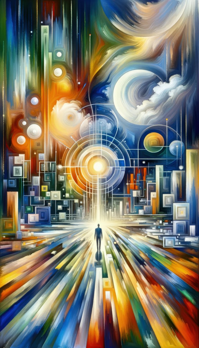 Titled Mindful Megabyte Convergence, this vertical Tachism style painting is an abstract portrayal of a day where mindfulness and megabytes coexist. Dynamic streaks of vibrant colors—blues, oranges, and yellows—create a sensation of motion towards the painting s center. Swirling patterns reminiscent of both natural and digital realms converge in the middle, suggesting a harmonious intersection of thought and technology. In the foreground, a solitary silhouette of a person appears to stand at the threshold of this convergence, adding an element of humanity to the composition. The figure seems to be contemplating the sublime nexus of living consciousness with the order and structure of the digital environment. The painting is rife with contrasting elements. Organic shapes and celestial spirals clash and blend with the geometric precision of squares and rectangles, symbolic of the digital world s binary structure. Bursts of light and shadow create depth and engage the viewer in a visual dialogue about the balance between human introspection and the omnipresent digital footprint that colors our contemporary existence. It is an ode to the modern age: a sensory and intellectual feast that encapsulates the essence of two worlds colliding and coalescing, painted with a sense of optimism for a future that embraces both the peace of inward reflection and the advancements of technological innovation.
