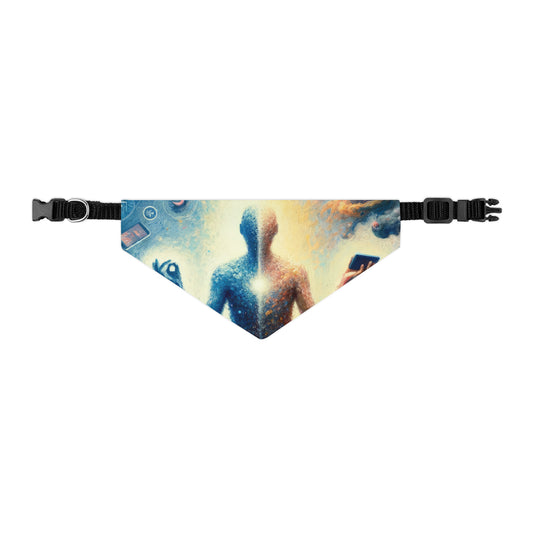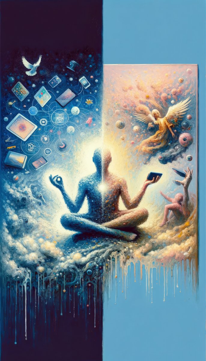 The image titled Spiritual Choice Transcendence is a vertical artwork rendered in a Tachism style, symbolically exploring the theme of choosing spirituality over material excess. The left-hand side of the piece emanates a cooler, darker vibe with rich indigo and navy tones, peppered with motifs like tarot cards, sacred geometry, and symbolic objects drifting amidst celestial elements. A white dove ascends, perhaps symbolizing peace and the soul s aspiration. The right-hand side contrasts with warmer hues, showcasing a burst of golden and pink light suggesting enlightenment, serenity and a heavenly aura. At the intersection of both worlds, a figure sits in a meditative pose, the essence of spirituality and inner peace, exuding a sense of calm and detachment. This figure appears to be releasing or swiping away an array of technological devices and consumer items, signifying a deliberate rejection of materialism in favor of spiritual growth. A humanoid form reaching out to a floating book suggests a longing for knowledge or divine wisdom. Above this transitional space flies an angel-like being, radiating light and further reinforcing the spiritual journey. The whole composition seems to float in a boundless, cosmic environment with ethereal clouds and soft drippings at the bottom, further implying the dissolution of physical boundaries and the fluid nature of spiritual transcendence.