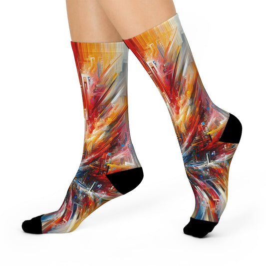 Titled Digital Chaos Symphony, this vertical Tachism style painting vividly encapsulates the theme of amid the din of digital dialogue . The canvas bursts with an array of striking colors that form a chaotic, abstract landscape, seemingly converging towards a luminous center. Streaks of red, orange, blue, and white overlap and intersect, symbolizing the torrent of digital communication. The image evokes a sense of movement and intensity, as if data streams are hurtling past at breakneck speeds. The abstract art interprets the overwhelming nature of the digital age where information flows are incessant and relentless. Each brushstroke seems to represent different voices and messages vying for attention, creating a symphony of visual noise that mirrors our often-overwhelming online interactions. Sharp lines and geometric shapes within the painting could be seen to echo the structured nature of digital systems, contrasting with the organic chaos of the overall composition. Indeed, the artwork does an excellent job in conveying a world inundated by streams of digital content, analogous to a cyber-metropolis that is both awe-inspiring and formidable. In the whirlwind of colors and forms, one can almost hear the cacophony of limitless digital exchanges resonating through the canvas.