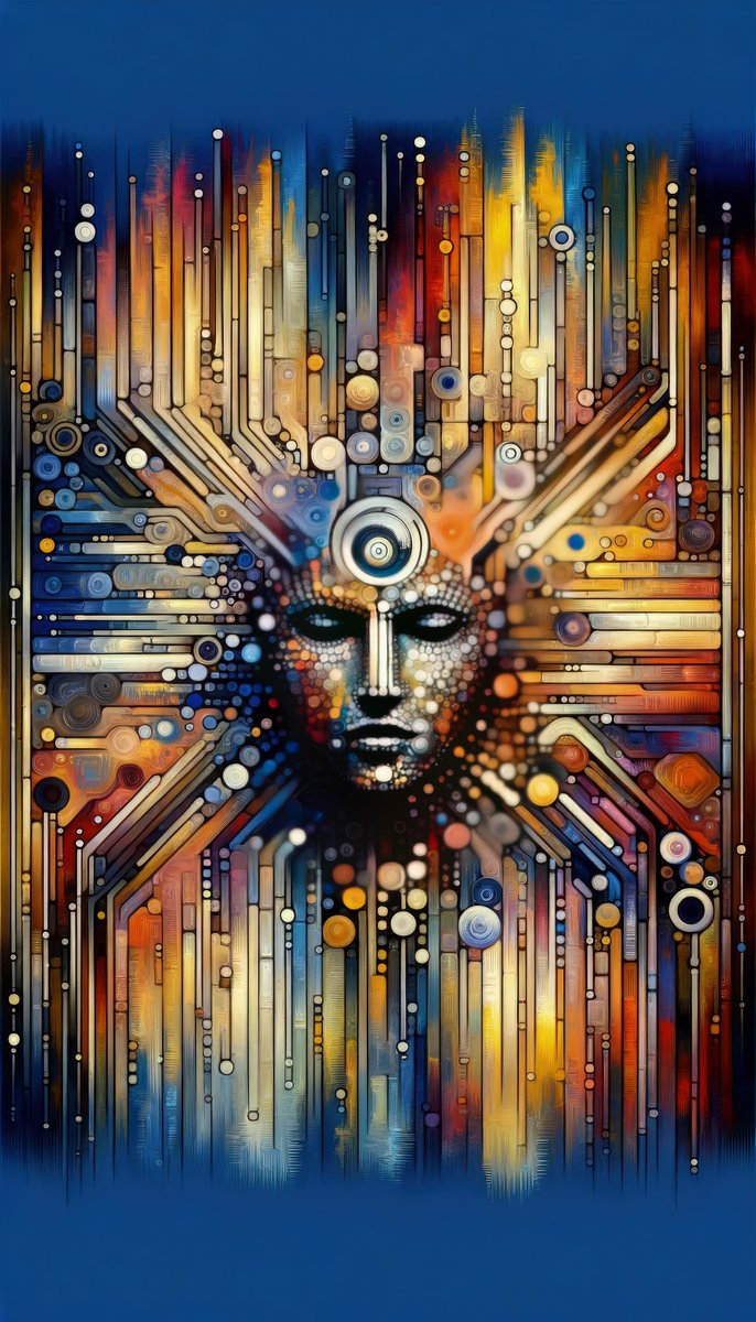 The image titled Digital Rhythm Tapestry is a striking vertical Tachism-style representation that could be interpreted to resonate with a digital and spiritual harmony. At the visual center is a stylized visage that appears to be a conduit for the vibrant energy emanating from or converging towards it. The face, composed of countless dots and strokes, has a meditative quality with closed eyes and a serene expression. From this central figure, lines, and circles of varying sizes and colors radiate outward, imbuing the image with a sense of rhythmic movement. These lines and dots could symbolize digital data streams or sound waves, underlining the digital inspiration of the artwork. The color palette is extensive, spanning warm hues of yellow, orange, and red transitioning to cooler tones of blue and indigo, suggesting heat and energy giving way to a tranquil void or perhaps the digital signal fading into infinity. Subtle textural gradients add depth to the composition, while the use of circles creates a sense of continuity and flow. The artwork combines abstract forms with a digital aesthetic to suggest the idea of an inner truth or essence transmitting through the digital medium, a theme that may resonate with the interconnectedness of technology and personal identity in the modern world.