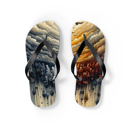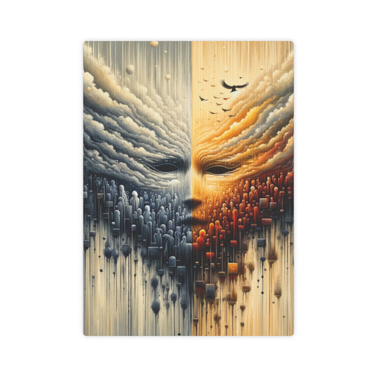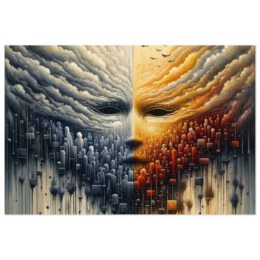 The image titled Subdued Revolutionary Currents is a stunning vertical artwork in Tachism style. Its composition evokes a sense of a quiet revolution unfolding beneath the surface. The top half of the painting features clouds in a turbulent sky that mirror the doom-like shapes below, creating a symmetrical division down the center of the canvas. The left side of the sky is cool with tones of grey and blue, and streaks of white paint suggest heavy rainfall. Against this backdrop, a flock of birds is in flight, adding a touch of life to the otherwise motionless expanse. Transitioning towards the right, the colors warm into an amber hue reminiscent of sunrise or sunset, illuminating the sky and the segmented clouds. This progression from cool to warm tones symbolically represents change or the passage of tumultuous events into a more hopeful future. Dominating the lower half of the artwork, there are numerous figures resembling the outline of people or tombstones. Their arrangement is fluid and dense, suggesting a crowd or movement, giving the feeling of a mass gathering or a collective force. Within this spectral throng, two prominent eye-like forms stare out, as if to signify the brewing consciousness or awakening spirit of revolutionary sentiment. Splattered and dripping paint connects the upper and lower halves, further emphasizing the idea of unrest and transformation beneath an ostensibly calm surface.