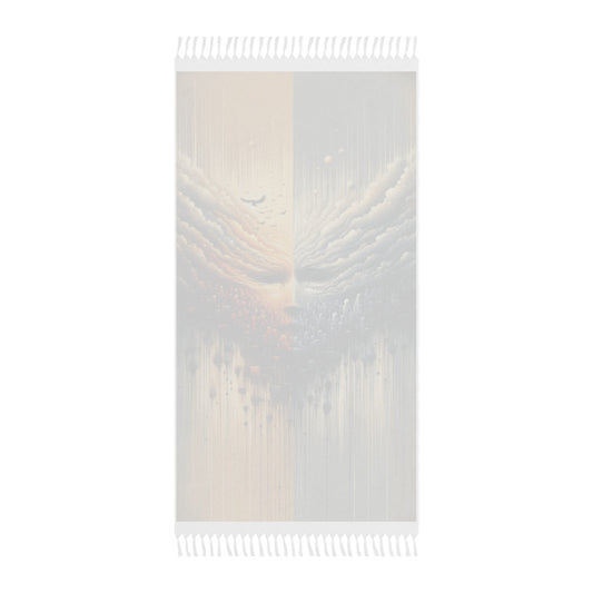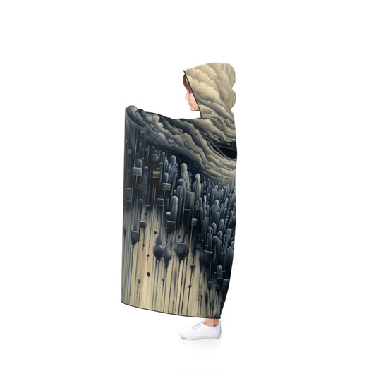 The image titled Subdued Revolutionary Currents is a stunning vertical artwork in Tachism style. Its composition evokes a sense of a quiet revolution unfolding beneath the surface. The top half of the painting features clouds in a turbulent sky that mirror the doom-like shapes below, creating a symmetrical division down the center of the canvas. The left side of the sky is cool with tones of grey and blue, and streaks of white paint suggest heavy rainfall. Against this backdrop, a flock of birds is in flight, adding a touch of life to the otherwise motionless expanse. Transitioning towards the right, the colors warm into an amber hue reminiscent of sunrise or sunset, illuminating the sky and the segmented clouds. This progression from cool to warm tones symbolically represents change or the passage of tumultuous events into a more hopeful future. Dominating the lower half of the artwork, there are numerous figures resembling the outline of people or tombstones. Their arrangement is fluid and dense, suggesting a crowd or movement, giving the feeling of a mass gathering or a collective force. Within this spectral throng, two prominent eye-like forms stare out, as if to signify the brewing consciousness or awakening spirit of revolutionary sentiment. Splattered and dripping paint connects the upper and lower halves, further emphasizing the idea of unrest and transformation beneath an ostensibly calm surface.