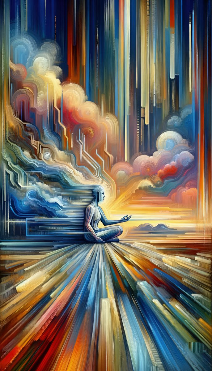 Titled Eternal Digital Meditation, this vertical Tachism style painting embodies a profound discourse on spirituality in the age of the internet. The artwork depicts a solitary figure in a meditative pose, grounded at the center of a whirlwind of vibrant, abstract strokes that seemingly pulsate from the figure s core to the edges of the canvas. At the heart of the composition, the serene figure becomes a bastion of tranquility amidst a dynamic backdrop suggestive of relentlessly fast broadband speeds. Technicolor streams that resemble fast-moving data packets or fiber-optic cables race outward and upwards, invoking the incessant flow of digital information that characterizes our era. The cacophony of colors and patterns around the figure contrasts with its peaceful, almost monochromatic, portrayal. Bathed in cool blues, the subject sits stoically, detached from the digital frenzy. The painting s aesthetic hints at the notion that despite the omnipresence and velocity of digital communication, spirituality retains its piercing relevance and remains undisturbed. Swirling clouds and straight, falling lines fill the upper section, perhaps alluding to the fusion of the ethereal and the structured, of the human spirit and digital constructs. The harmonious interplay of warmth and coolness, diffusion and precision, silence and noise, encapsulate the message that inner peace can persist even as the world accelerates around us.