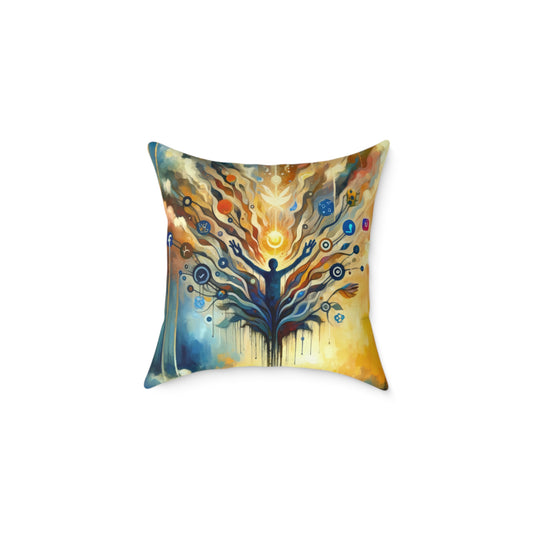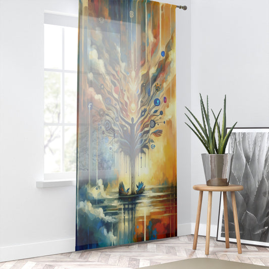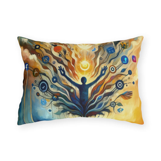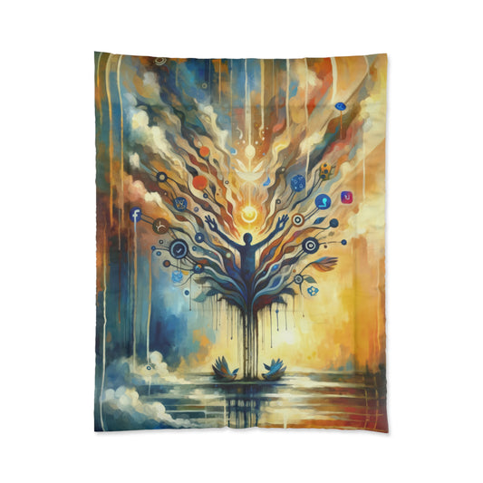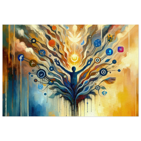Titled Reflective Digital Meditation, this vertical image is an enchanting visual ode to the intersection of digital life and introspective calm. The image is executed in a Tachism style, showcasing a flurry of brushstrokes and colors that come together to form a captivating scene. At the center is the silhouette of a person, arms raised upwards, morphing into a sprawling, tree-like structure. The limbs of the tree are adorned with an array of icons representing various social media platforms, symbolizing the pervasive nature of the digital world. This digital tree bursts with effervescent light, dots, and spherical shapes, perhaps indicative of ideas, posts, and the constant flow of online interaction. These elements seem to float upwards, signifying the transcendence of thoughts and the potential for reflection amidst the relentless pace of digital communication. The bottom of the image features serene blue birds on either side, perched beside the tranquil waters that reflect the chaos and beauty of the structure above. These birds could represent moments of peace and contemplation that are often sought but hard to find in our connected lives. The colors seamlessly blend from the warmth of oranges and yellows, embracing a hopeful dawn or sunset, to cool blues and deep indigos, suggesting depth, introspection, and the vastness of cyberspace. Overall, the image is a resonant portrayal of the quest for stillness and meaning in the age of information overload, inviting viewers to find their own space of meditation in the digital ex