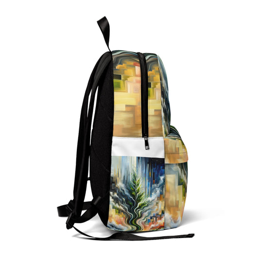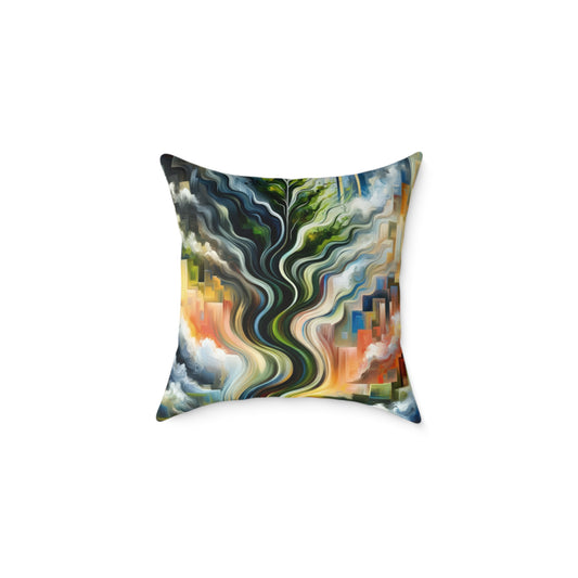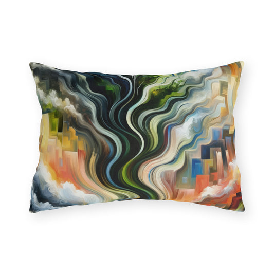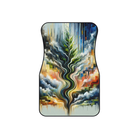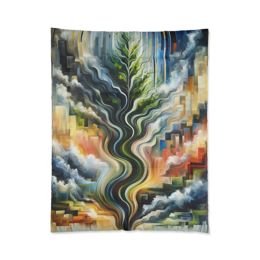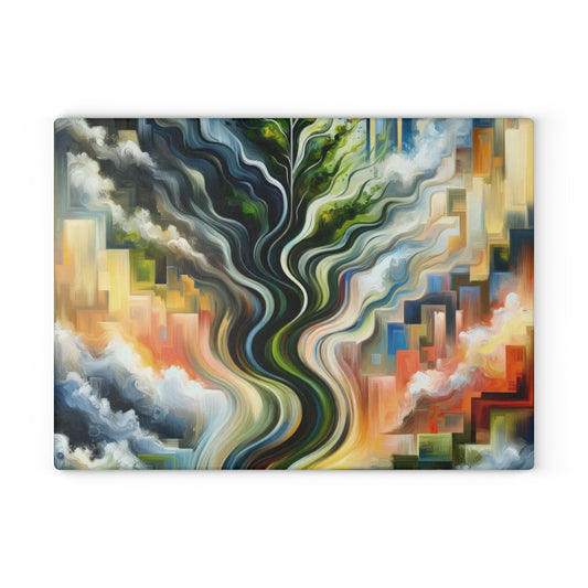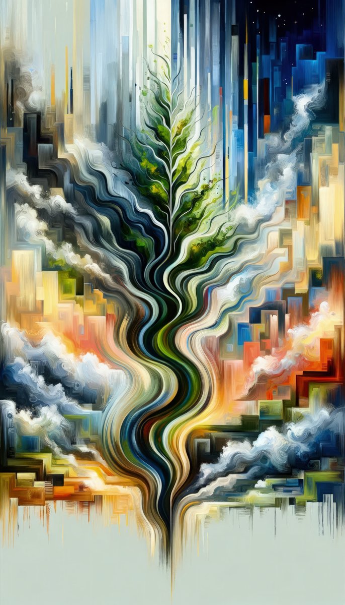 Titled Eternal Digital Contrast, this vertical Tachism style painting embodies a profound juxtaposition of organic continuity and digital transformation. The central motif, an evergreen tree, rises resiliently amid the dynamic chaos, its foliage and trunk rendered with sinuous, lifelike strokes. This tree stands as a metaphor for unwavering vitality and natural constancy within the relentless flux of digital seasons. Surrounding the tree are abstract elements that suggest the digital realm through geometric shapes, pixelated forms, and stark color contrasts. The left side of the composition features cooler tones and smooth, vertical lines that evoke a serene sense of order and digital sophistication. In sharp distinction, the right side plunges into a nocturnal palette with hints of glowing artificial lights and an enigmatic depth, implying the vastness and mystery of digital space. The interplay between the tree and its environment is a visual dance of styles and themes. Brushstrokes fluidly oscillate between organic curves and precise edges, representing the interface between the natural world and the constructed reality of the digital age. Underneath, the reflection of the tableau in more subdued tones further enhances the dreamlike and contemplative qualities of the work, inviting the observer to consider the relationships and contrasts that define our modern existence.