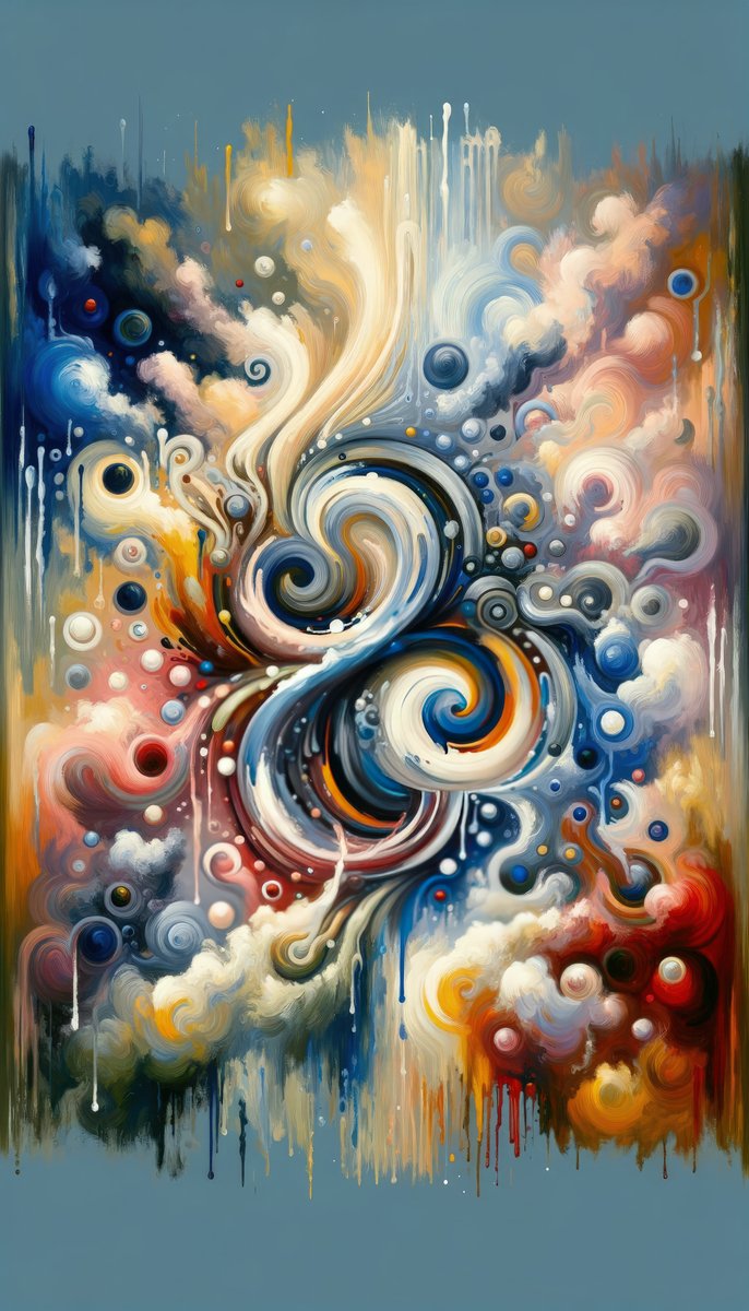 The image titled Paradoxical Embrace Tachism is a vertical representation of the Tachism style, vividly symbolizing the concept of Embracing the Paradox. It features an intricate interplay of swirling patterns and organic shapes that seem to permeate the canvas, creating an enigmatic yet harmonious composition. In the center of this abstract piece, there is a dynamic figure shaped like a swirling infinity symbol, painted in contrasting shades of vivid blues and bold oranges. Around this central motif are myriad orbs and circles, some opaque and others translucent, as if floating amidst an ethereal backdrop. These circles vary in size and color, ranging from pale blues to deep reds, symbolizing a diverse spectrum of ideas or emotions. The background is a masterful gradient of colors, seamlessly transitioning from a darker upper section featuring shades of navy and black to lighter, ethereal tones of gold, cream, and light blue at the bottom. Throughout this transformation, there are elements that resemble dripping paint, adding a raw, fluid quality to the image. This effect intensifies the sensation of motion and adds a textural contrast to the smooth spirals and orbs. This artwork encapsulates the essence of Tachism, an art movement focused on the spontaneous and subconscious creation, with an emphasis on the physical act of painting. It creates a sense of depth and complexity, inviting viewers to interpret the abstract forms and discover their own meanings within the Paradoxical Embrace.
