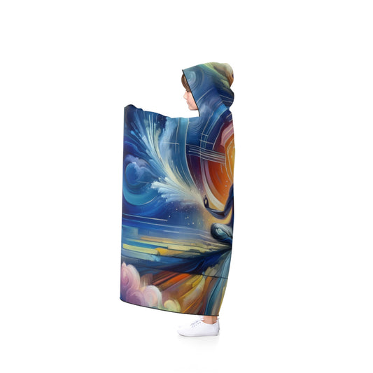Titled Techno Spiritual Synthesis, the painting is a captivating vertical Tachism style artwork. At its core, a serene figure in a lotus position calls to mind the age-old practice of meditation and spiritual introspection. The figure exudes a sense of calm amidst the dynamic backdrop, symbolizing an embrace of a tech-infused spiritual practice. The energy around the meditator merges the vibrant classic elements of spirituality with futuristic digital undertones. This fusion is apparent through the striking interplay of warm and cool hues that converge at the image s center, radiating outward in swift, streaking lines and organic swirls. Electric blues and calming indigos swirl against fiery oranges and radiant yellows, painting a picture of harmony between the digital pulse of technology and the tranquil pulse of spiritual existence. This visual concoction effectively conveys the merging of two seemingly disparate realms into a cohesive and mutually enhancing visual tableau. The light appears to emanate from the figure itself, suggesting that the spiritual and the technological enhance one another, illuminating the path for a modern approach to inner peace and cosmic connectivity. This picture acts as an emblem of the intriguing dance between the advancement of mankind and the timeless pursuit of spiritual evolution.