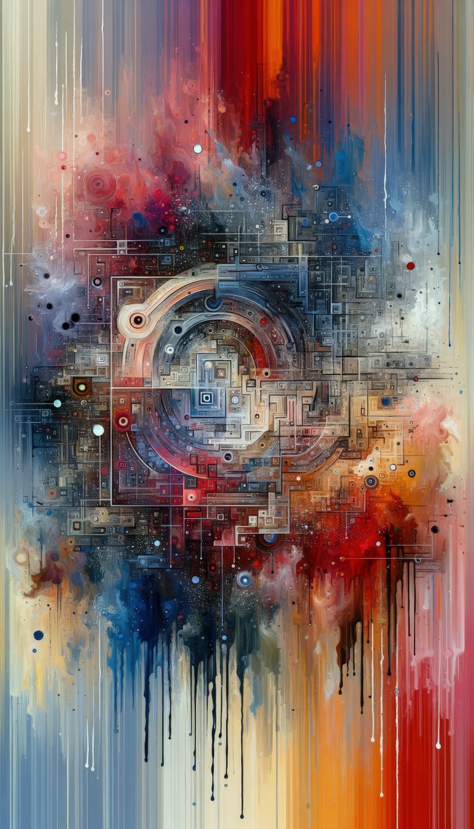 The painting titled Awareness Algorithm Tachism is a compelling vertical image that masterfully represents the abstract concept of awareness through the Tachism style. It showcases a complex central motif composed of intricate geometric patterns that resemble a sophisticated, futuristic circuit board or maze. These layered shapes and symbols create a sense of depth and complexity, alluding to the intricate workings of an algorithm. Surrounding this central structure is a vibrant explosion of colors ranging from warm reds and oranges to cool blues, suggesting a spectrum of heat and emotion. This vivid backdrop seamlessly blends with the central design, with colors bleeding into each other, creating a dynamic interplay between order and chaos. Drips of paint cascade down the canvas, adding a raw, organic texture that contrasts with the calculated precision of the algorithmic patterns. These drips also evoke a feeling of motion and transformation, as if the concept of awareness is perpetually evolving and eluding complete understanding. The image stimulates a contemplation on the nature of consciousness and the mechanisms by which we perceive and understand our surroundings. It is both an homage to the analytical processes that define our cognitive awareness and a mesmerizing visual spectacle that captures the viewer s imagination. This artwork invites introspection into the ever-changing landscape of thought and perception through its rich symbolism and emotive color palette.