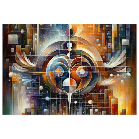 The image titled Tech Spirit Balance is a vertical Tachism style painting that serves as a visual interpretation of the symbiotic relationship between technology and spirituality in real-world applications. The abstract art piece is rich in vibrant hues, including deep blues, warm oranges, fiery reds, and glowing yellows, creating a dynamic and complex visual experience. At the bottom of the painting, there is a checkered floor that leads to the vivid chaos of color and form above. The floor s reflective surfaces suggest a high-tech environment and converge toward a vanishing point, guiding the viewer s eye upwards. Above the floor, the painting is divided into two distinct yet interconnected halves by a vertical line of white, opaque dots. On the left side, architectural forms resembling skyscrapers and circuit-like patterns ascend in a celebration of technological progress. These structures are rendered with hard edges and cubes, much like a city skyline. Contrastingly, the right side of the composition features more organic shapes and softer transitions of color, suggesting a more spiritual or mystical essence. Central to the canvas is a large circular motif intertwined with feathered wings, signifying a balance or fusion of two forces—potentially the material and ethereal realms. Throughout the canvas, smaller circular elements and dots connect and unify the two halves, symbolizing the interconnected nature of technology and spirit. The overall impression is one of harmony between the structural, man-made world and the fluid, intangible aspects of human experience.