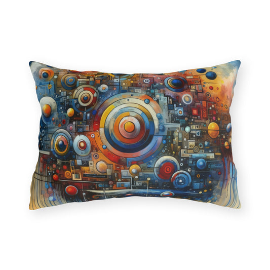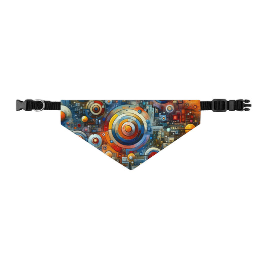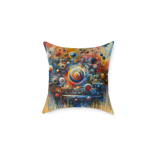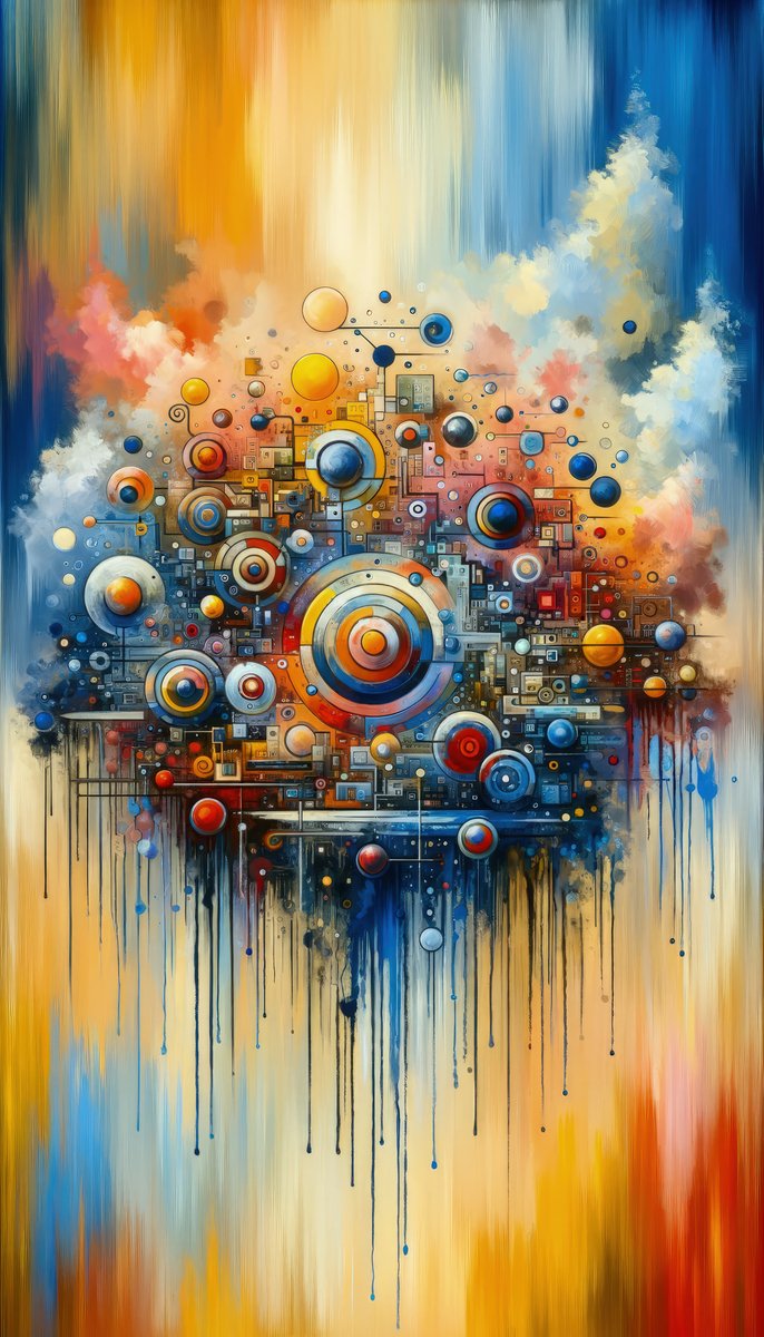 Titled Connected Virtuality Canvas, the artwork is a vertical image rendered in a Tachism style that symbolically represents the concept of Virtual Community, Tangible Connections. The canvas is ablaze with an array of warm hues, dominated by golden yellows, deep reds, soothing blues, and serene whites, creating a backdrop that transitions vertically from vibrant intensity to calmer tones. The central focus is a dense, circular motif, resembling a futuristic city or complex circuitry seen from above. This intricate network comprises numerous circles, squares, and abstract elements, which might evoke the interconnected nodes and links of a digital network. These shapes are rich in contrasting colors, sizes, and textures, and they seem to radiate out from a large, concentric focal point that anchors the composition. Drips of color cascade down from the agglomeration, suggesting the bleeding or blending of the digital into the physical realm — an artistic translation of virtual connections impacting real-world experiences. Some of the drips appear to be in motion, creating a dynamic aspect as if the virtual and tangible worlds are actively interacting. Techniques of blending, layering, and splattering conjure a sense of organized chaos, vividly expressing the nature of online communities pervasive yet unseen influence. Through the rhythmic repetition of circular patterns and the fluidity of lines, the painting conveys a seamless flow of interaction and connectivity within the boundless expanse of cyberspace.