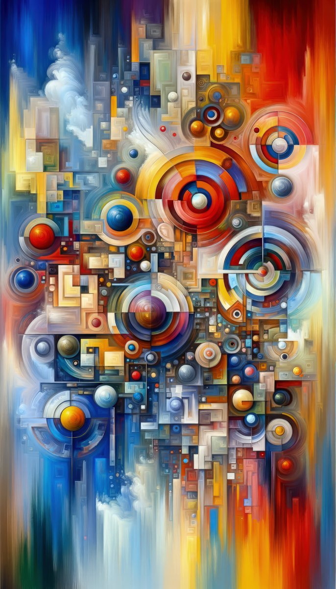 The image titled Coexistence Harmony Code is a vibrant vertical Tachism style painting that captures the abstract essence of harmony and interconnectedness. The artwork is a tapestry of bold, dynamic shapes and intense, fluid colors. Dominating the composition are concentric circles and spheres that radiate outwards, reminiscent of cosmic ripples or the growth rings of a venerable tree. These forms in red, blue, and yellow hues, among others, suggest a sense of unity and continuity. Surrounding these circular motifs is a mosaic of geometric shapes — squares, rectangles, and small intricate blocks — creating a complex urban-like grid. The juxtaposition of these straight-edged forms with the organic round shapes hints at the diverse elements that coexist in a balanced state. Colors transition seamlessly from cool to warm spectrums, adding depth and dimension to the scene. On either side of the painting, vertical streaks of white, gold, and crimson cascade down, integrating the contrasting elements and symbolizing a blending or merging of different aspects. The overall effect of the painting is one of cohesion, where each distinct part contributes to a greater, harmonious whole. The artwork could be interpreted as a visual metaphor for the societal Code of Coexistence, where various elements, characteristics, and entities harmonize to create a unified and balanced existence.