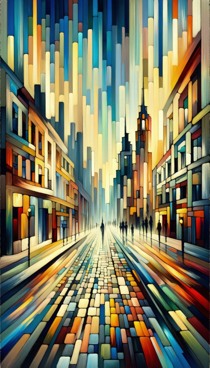 Cobbled Rhythm Heartbeat is an evocative vertical Tachism style painting that encapsulates the essence of an urban landscape infused with energy and movement. The composition is centered around the depiction of a street, with an exaggerated, cobblestone foreground that leads the viewer s eye toward a vanishing point flanked by stylized building facades. The buildings are rendered with a mosaic of vertical and horizontal color streaks, which give a sense of towering architectural forms reaching towards a sky awash with light. The color palette is vibrant and varied, comprising warm hues of yellow, red, and orange, contrasting against the cooler blues and whites, suggesting different times of day and atmospheric conditions. In the middle distance, silhouettes of people add a human element to the cityscape, conveying the motion of life within the static composition. They appear to be moving toward or away from the viewer, along the cobbled path, emphasizing the painting s theme of rhythm and the heartbeat of the city. The dynamic brushwork and abstract interpretation of the urban environment suggest the constant beat and dance of city life. The play of light and shadow, along with the deviations in perspective, create a pulsating effect, simulating the silent music to which the city moves. This artwork captures not only the visual but also the sensory experience of the urban rhythm and the pulse of human activity at its core.