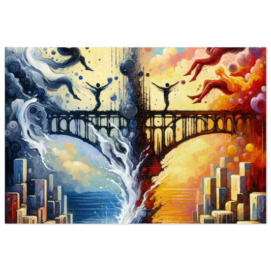 The image titled Faithful Diving Bridges is a vibrant vertical piece in Tachism style, depicting a powerful contrast between the acts of diving and building bridges. Vivid and rich colors divide the canvas diagonally, warm tones of red and orange on the lower left side and cooler shades of blue on the upper right. This color division creates a dynamic visual metaphor for the concepts of faith and pragmatism. At the top, there are two silhouetted figures, one on each side of the composition—both are diving headlong towards the water below, which is rendered with an impression of depth and reflexivity. These figures seem to embody the theme of immersing oneself in the waters of faith, surrendering to the unknown with an unreserved trust. In stark contrast, the central part of the piece features an intricately detailed bridge spanning across a tumultuous divide, connecting two sides that seem to represent different aspects of human experience. This bridge stands as a symbol of the methodical, purposeful construction of connections—whether they be between people, concepts, or life phases. Below, the reflected image in the water adds a dream-like quality to the scene, blurring the lines between reality and reflection, and hinting at the oftentimes fluid boundary between faith and reason. Bubbles and abstract shapes float around, adding to the ethereal feel of the moment captured. Overall, the piece presents a striking and thought-provoking representation of contrasting life approaches.