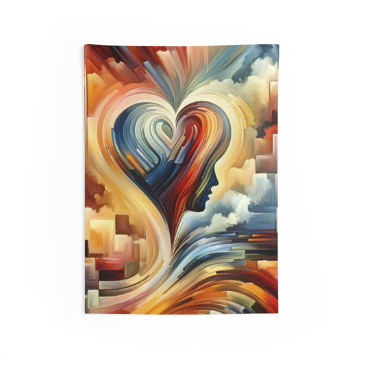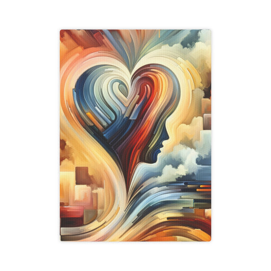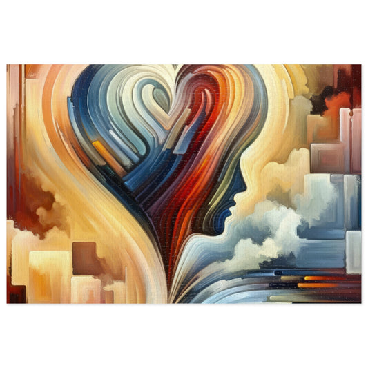 The image titled Heartfelt Lexicon Unity is a vibrant vertical Tachism style painting that captures the essence of emotional communication through its dynamic use of color and form. At its center, the composition showcases a prominent heart-shaped figure, meticulously formed by an array of swirling lines and curves that draw the viewer s eye inward. This heart acts as the focal point, embodying the theme of becoming conversant in the language of the heart—the lexicon that unites and empowers . Surrounding the heart motif, streaks of warm reds, oranges, and yellows flow with energy and passion, suggesting the fervor of heartfelt communication. These intense colors transition into cooler shades of blues and whites towards the outer edges, invoking a sense of calm clarity that comes with true understanding and connection. Textural variations within the painting add depth and movement, while geometric shapes resembling cityscapes or building blocks at the bottom give a sense of foundation and structure to the expressions of the heart. The juxtaposition of organic and architectural elements within the work highlights the harmony between raw emotion and the organized articulation of feelings. Overall, the imagery in Heartfelt Lexicon Unity offers a powerful visual metaphor for the deep, unspoken connections that bind individuals together through shared sentiments and mutual comprehension.