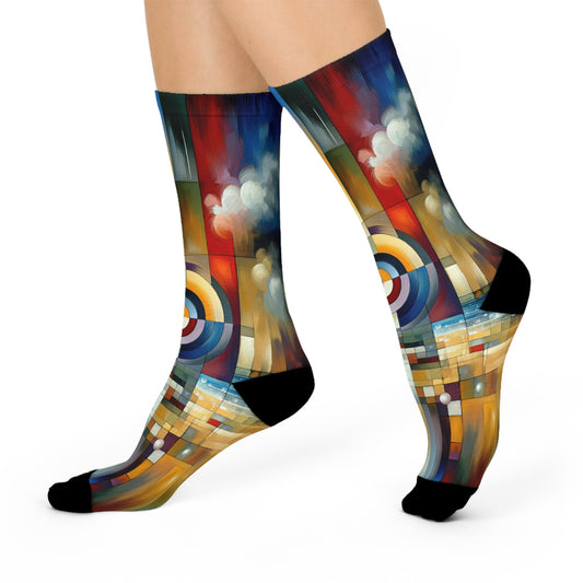 The image Oneness Through Tachism is a striking vertical Tachism style painting rich in color and texture. Tachism, a style of abstract painting, is characterized by splashes and dribbles of paint, yet this piece interprets that style in a more structured manner. The composition is a mosaic of vibrant, blurred blocks and strokes, creating a lively and dynamic mosaic. It evokes the complexity and diversity of existence through its varied hues and tones. At the painting s heart is a series of concentric circles, transitioning from dark to light colors, culminating in a bright center. Two white spheres seem to hover over the rings, suggesting balance and symmetry. This focal area might symbolize a point of convergence or an ultimate truth that scholars and mystics seek, surrounded by the chaos and fragmentation of the outer world. Below the circles, the painting features a reflective surface akin to water, adding a sense of depth and another layer of meaning—perhaps implying a form of deeper reflection or the subconscious. Above and around the central motif, abstract clouds or misty forms float, giving a sense of transcendence or spiritual ascent. Overall, the artwork captures the essence of simple acts laying the profound truths of existence and the sense of oneness that unites all inquiries and paths. The use of warm and cool colors together with orderly segments and the soft, organic forms suggests an underlying harmony in the apparent disorder, reflecting the paradoxical nature of reality.