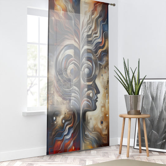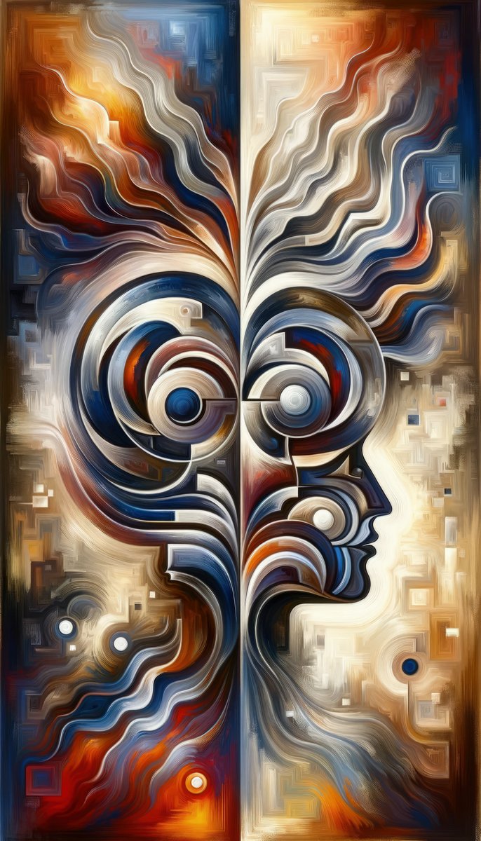 The image, titled Wisdom Confluence Tachism, is a striking vertical Tachism style painting rich in symbolism and abstract expression. At its heart lies the metaphor of a confluence of minds that sharpens the blade of inner wisdom with the whetstone of practical know-how. Divided into two primary sections, the painting alludes to the concept of a book, possibly a symbol for knowledge and learning. On one side, fiery oranges and reds swirl with dynamic energy, suggesting passion, creativity, and the fervor of intellectual pursuit. On the opposite, cooler tones of blue and beige create a more serene and contemplative ambiance, evoking calmness, reflection, and the distilled essence of experience. Central to the composition is a dual profile that forms a singular, stylized face when joined. This face, with eyes closed as if in deep thought or meditation, represents the unity of different ideas and diverse thoughts, merging to form a consolidated source of wisdom. Around the visage, spirals and circular motifs echo the complex layers of understanding that arise from the blending of theoretical knowledge with practical application. This artwork is reflective and evocative, inviting viewers to consider the depths of their own intellectual and experiential learning and to celebrate the harmonious blend of theory and practice that fosters true wisdom.