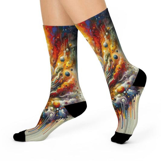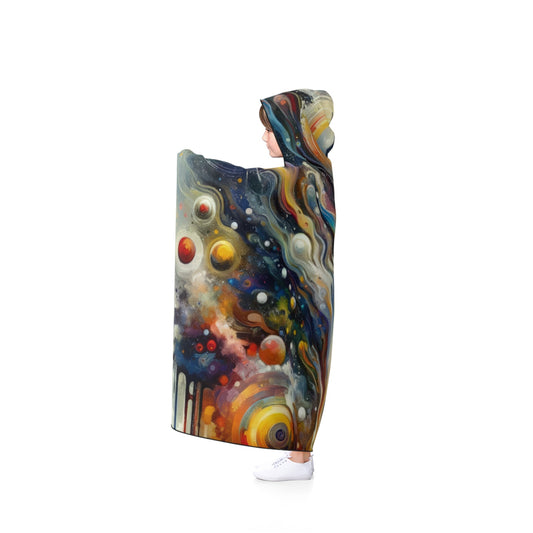 Titled Cosmic Vision Tree, the image is a vibrant vertical artwork that embodies the essence of Tachism, an abstract painting style. It symbolically represents the concept of Vision Boarding Your Universe, where the visualization of aspirations and dreams merges with the infinite possibilities of the cosmos. The central focus of the piece is a majestic tree, its branches stretching upwards and outwards, transcending into a celestial array of planets, stars, and astral bodies. The tree s roots and trunk are painted with warm, fiery hues of red, orange, and yellow, blending seamlessly into cooler tones of blues and purples, suggesting a balance between passion and tranquility in the universe one envisions for themselves. Surrounding this cosmic tree, the background is a tapestry of deep space, with a multitude of spherical forms representing celestial orbs in various sizes and colors. They float amidst swirling patterns and concentric circles, alluding to the orbits of planets and the dynamic movements within galaxies. Streaks of paint in various directions invoke the sensation of shooting stars or comets, imparting a sense of motion and energy. White spots scattered across the canvas mimic distant stars, enhancing the depth and complexity of this universal vista. A solitary silhouette of a person, arms raised in awe or triumph, stands at the base of the tree, symbolizing the human connection to this vast and wondrous universe. This figure seems to be both a witness to and a participant in the cosmic dance, embody